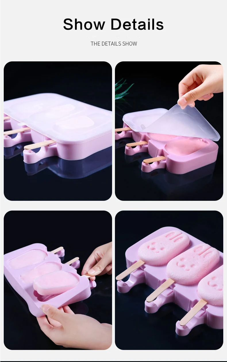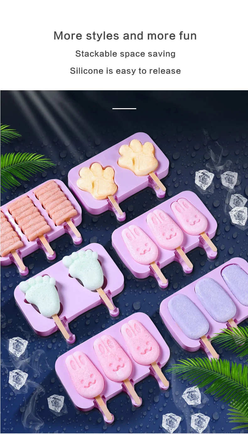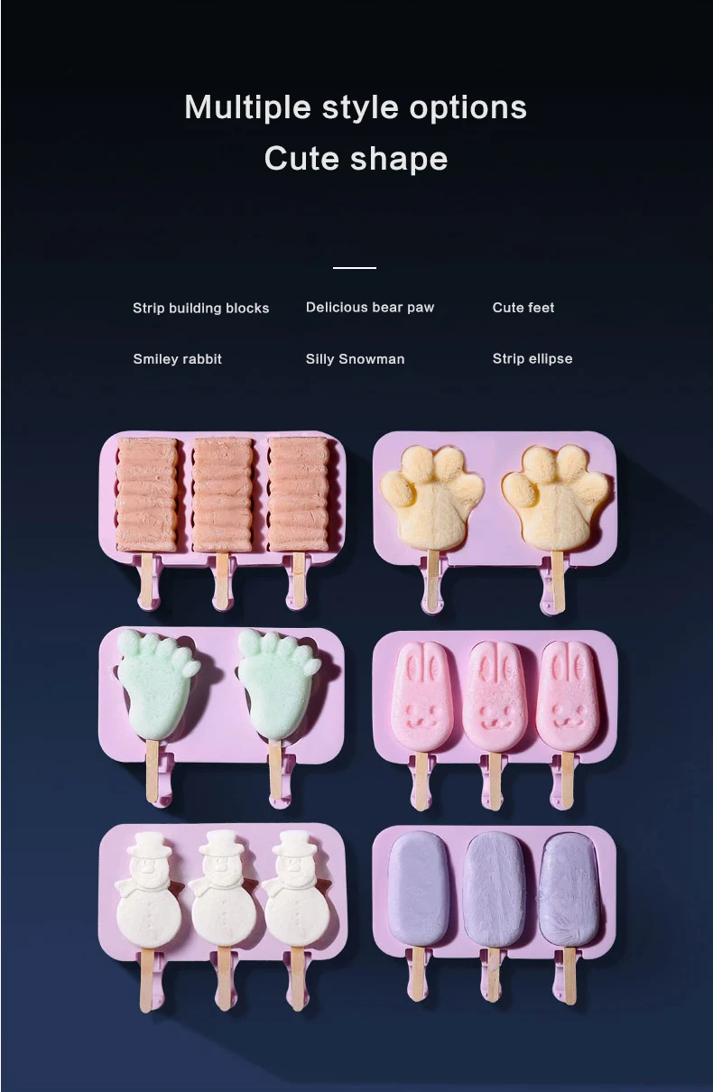 Specification Pattern: Christmas tree/oval/snowman/stripe Color: purple Product size: 195*100*25mm Material: silicone Certification: FDA approved Temperature range: -40-230° Package list: 1*ice cream mold 50*wood sticks Product Description