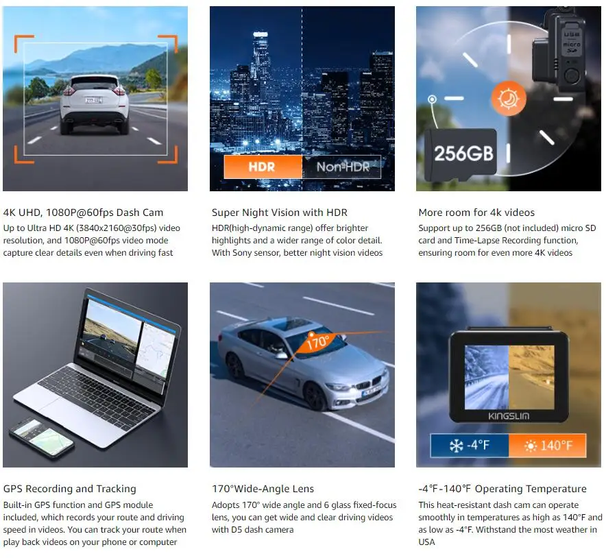 Запись 4K Ultra HD: видеорегистратор Kingslim D5 снимает видео 4K(2160P @ 30fps) UHD и видео 2,5 K (2560x1440 @ 30fps)/1080P @ 60fps Full HD видео, четкий захват номерных знаков и дорожных знаков для каждой записи