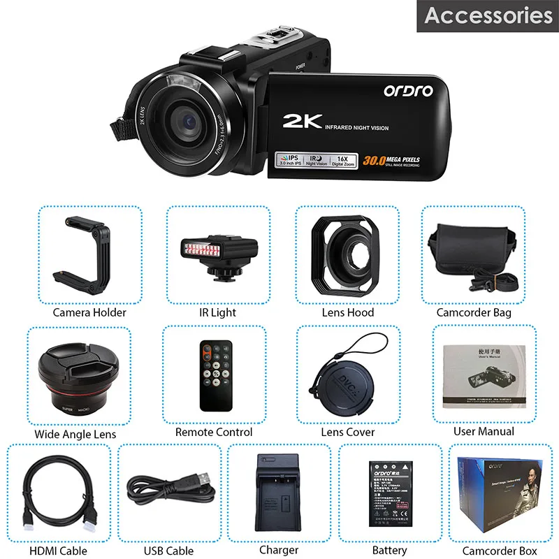 Функция ИК ночного видения и ИК-светильник: камера ночного видения сама оснащена ИК-светильник и камера оснащена внешним ИК-светильник, который предназначен для вас, чтобы сделать несколько снимков изображения и видео в ночное время.(IR iamge черно-белый). Видеокамера портативная и легкая, что позволяет легко брать в любом месте. 2K видеокамера: с cmos-датчиком Sony 8MP, видеокамера ORDRO Z63 захватывает 2k Высокое разрешение 2560x1440(30 кадров в секунду) яркие видео и высокое качество 30MP неподвижное изображение. Эта видеокамера также имеет 3,0 дюймов IPS HD сенсорный экран с 270 градусов вращения. Идеальная видеокамера для любителей и начинающих снимать. Он поддерживает зарядку во время записи. Функция Wi-Fi: Загрузите приложение «JUST DV» на смартфон и подключите устройство. Эта функция Wi-Fi позволяет легко снимать удивительные фотографии в удаленном режиме. Удобно делиться фотографиями и записанными видео, снятыми нашей цифровой видеокамерой на Facebook, Instagram или YouTube, когда захотите. Функция веб-камеры: видеокамера Ordro z63 может использоваться в качестве веб-камеры через подключение камеры к компьютеру с помощью usb-кабеля и поддерживает выход HDMI (Используйте кабель HDMI). Широкий формат линзы из поликарбоната и Камера держатель: это видео Камера оснащен профессиональным 2-в-1 0.39x (с макро объектив б/у) Широкий формат объектив для более широкого спектра съемки. Используйте макрообъектив для съемки крупным планом, например, растений и животных и т. Д. (советы: широкоугольный объектив в основном используется d для дальней съемки, макрообъектив для съемки крупным планом, диапазон макросъемки 4-5 см). Складной ручной держатель используется для повышения стабильности при съемке. Вы получите 1 * видеокамера ORDRO Z63, 1 * ИК светильник ночного видения, 1 * широкоугольный объектив, 1 * бленда объектива, 1 * держатель камеры, 1 * USB кабель, 1 * кабель HDMI, 1 * пульт дистанционного управления, 1 * сумка для камеры, 1 * Руководство пользователя, 1 * зарядное устройство, 1 * перезаряжаемые литиевые батареи, 1*32GB micro SD карта