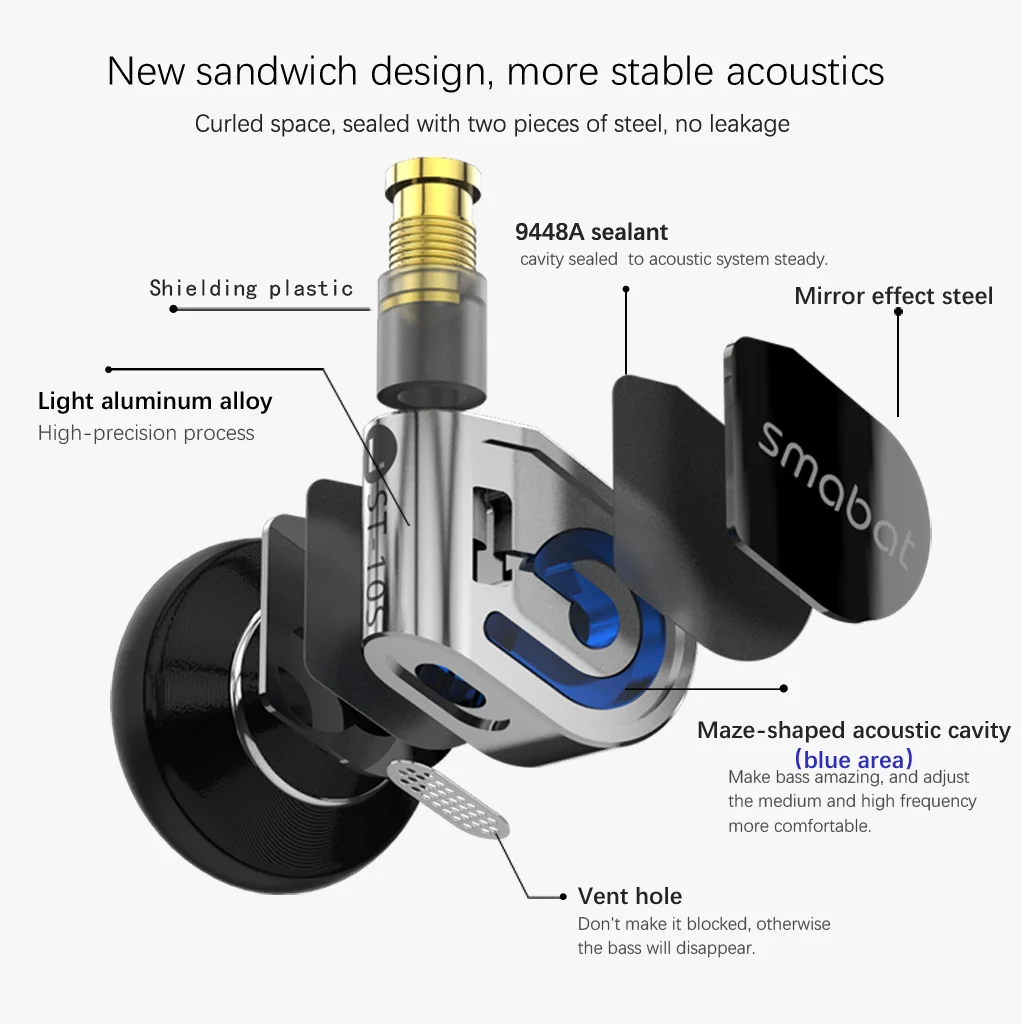 Трехслойные Hi-Fi наушники-вкладыши smatus ST10s 15,4 мм со съемным кабелем MMCX, акустическая полость из алюминиевого сплава в форме лабиринта