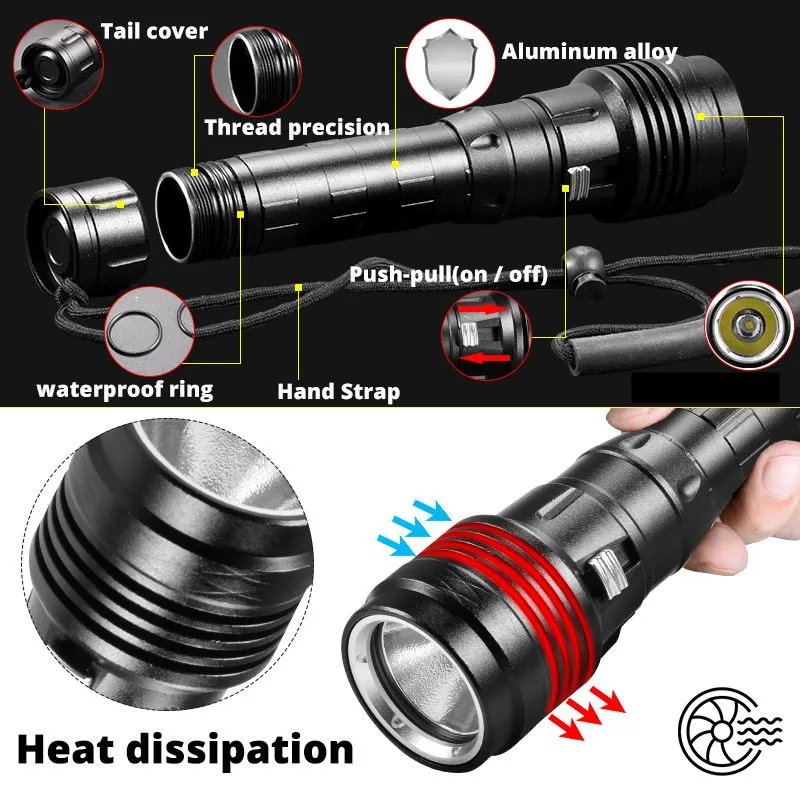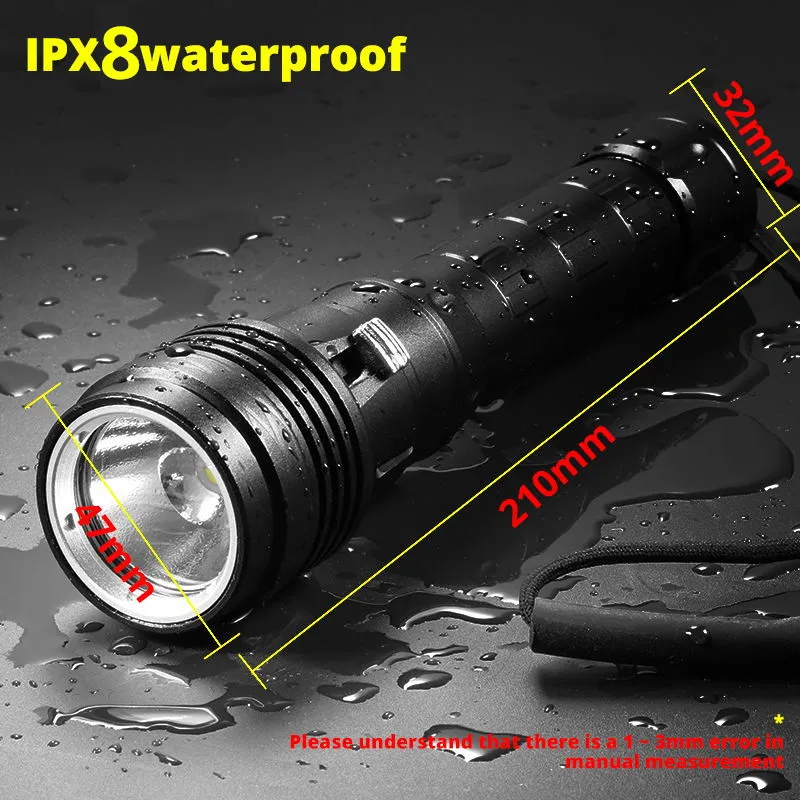 ★Мощный 8000 люменов: Максимальная мощность 8000 люменов мощного подводного фонарика с высоким режимом, который дает вам супер яркое нейтральное белое освещение для подводной деятельности. ★Глубина погружения до 250 метров: IPX8 водонепроницаемый уровень этот фонарь для дайвинга делает его надежным в дайвинге, поиске, аварийной ситуации, во всех видах спорта на открытом воздухе. ★Технология поверхности: новейшая Алмазная жесткая анодированная. ★Объектив: оптический двухсторонняя стекло с покрытием, его светильник с высоким коэффициентом пропускания до 91%. ★Отражатель: материал из алюминиевого сплава, ударопрочный и устойчивый к царапинам, антивозрастной, хорошая огнестойкость