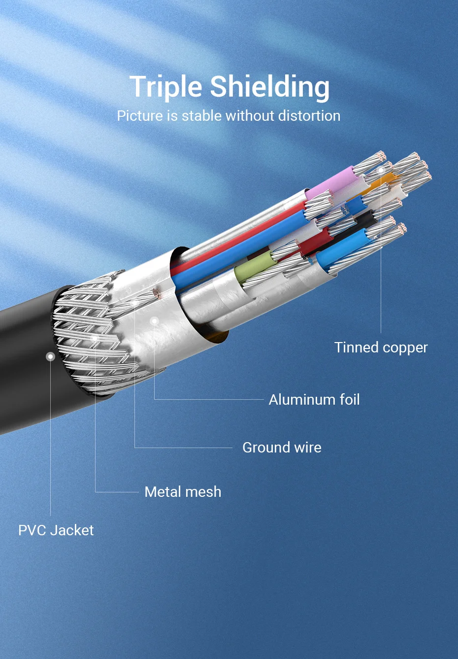 Tinned copper with triple shielding(alumium foil & metal mesh & PVC jacket), make picture display stable without distortion.