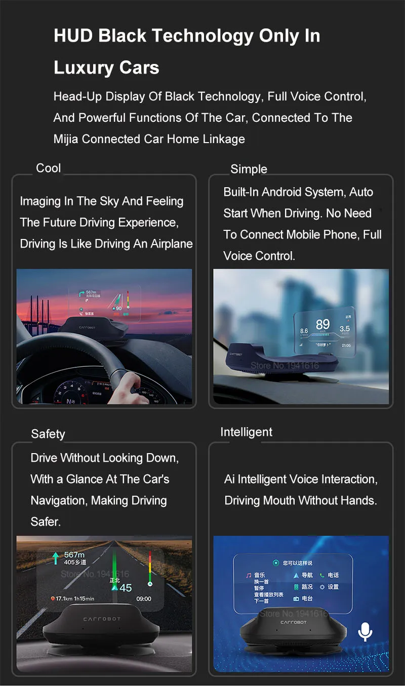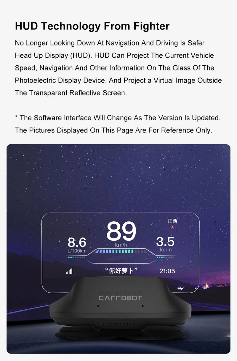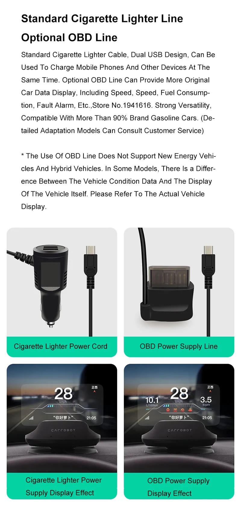 Это продукция Xiaomi ecological chain, на ней нет логотипа Xiaomi, спасибо за понимание! Информация о продукте Название продукта: Carrobot Smart HUD Рабочее напряжение: 12 В постоянного тока Рабочий ток: 1A Ток в режиме ожидания: 0.05A Источник питания: источник питания прикуривателя/источник питания OBD Рабочая температура: -20 °C ~ 75 °C Увеличение: около 8,5 раз Размер изображения: виртуальное изображение 9,5 дюйма Расстояние изображения: 1,5 метра Список товаров Хост X1 Основание X1 Шнур питания прикуривателя X1 Шестигранный ключ X1 Общая проблема -Есть ли у HUD требования к установочному пространству? Рекомендуется установить изделие выше приборной панели автомобиля, Пожалуйста, измерьте, достаточно ли места над приборной панелью автомобиля. Вы можете отрезать прямоугольный картон высотой 9,7 см и длиной 14,5 см. Поместите картон между приборной панелью и ветровым стеклом. Если размер картона может быть легко перемещен, автомобиль может положить HUD. -Какие Совместимые модели HUD? Когда HUD использует стандартный метод питания прикуривателя, нет специальных ограничений на модели автомобилей. При использовании режима питания OBD версия HUD Zhixuan поддерживает большинство моделей, оснащенных интерфейсами OBD, произведенными после 2008 года. Он не поддерживает использование других нетопливных транспортных средств, таких как электромобили и гибриды. На некоторых моделях данные о состоянии транспортного средства и отображение самого транспортного средства отличаются. Пожалуйста, обратитесь к фактическому дисплею транспортного средства. -Каковы характеристики HUD? HUD-это полностью функциональная и экономичная интеллектуальная универсальная машина HUD со встроенной системой Carrobot. Он запускается автоматически во время вождения и может реализовывать все интеллектуальные функции, не подключая мобильный телефон. -Будет ли HUD влиять на вождение во время использования? Экран виден в верхней части во время использования, и Прозрачный фон проекции не влияет на вид безопасного вождения. -Как использовать HUD? После включения HUD, кричите «Привет, репа», чтобы проснуться. После пробуждения вам нужно только взаимодействовать с Carrobot голосом, например: «Навигация на площадь тяньаньмэнь» «Позвоните своей жене», играйте в песню Lin Junjie «АЗС», я хочу услышать новости» и так далее. -Как HUD работает онлайн? HUD имеет встроенную карту потока патч, которая автоматически включается после включения питания, и вы можете перейти в Интернет. Вы также можете перейти в Интернет, подключив к точке доступа мобильный телефон. -Мне нужно зарядить HUD трафик? С даты активации, карта данных HUD даст вам ежемесячную бесплатную посылка данных и 3-летнюю базовую посылка данных. Вы можете приобрести дорожные пакеты в апплете WeChat. * Основная посылка: Неограниченный трафик, доступ к голосовому взаимодействию, чату, погоде, OTA и другому контенту. * Наслаждайтесь посылка дорожного движения: Неограниченный трафик, вы можете получить доступ к навигации, электронной собаке, дорожных условиях, музыки, радио и другого контента. * Встроенная карта потока-это карроборная карта направленного потока и не может поделиться сетью для мобильного использования.