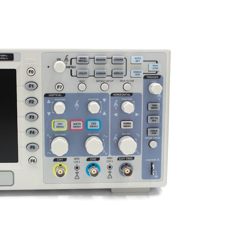 Полоса частот 70 МГц 1gsa/s частота образцов в реальном времени Большой (7,0 дюймов) цвета могут отображаться WVGA(800x480) Длина записи до 40K Режим триггера: кромка/ширина импульса/линия выбора видео/Слип/сверхурочные и т. Д. USB хост и подключение устройства, стандарт Несколько автоматических измерений Четыре Математические Функции, включая стандарт FFTs Предоставляет программное обеспечение для анализа в реальном времени ПК VGA опционально