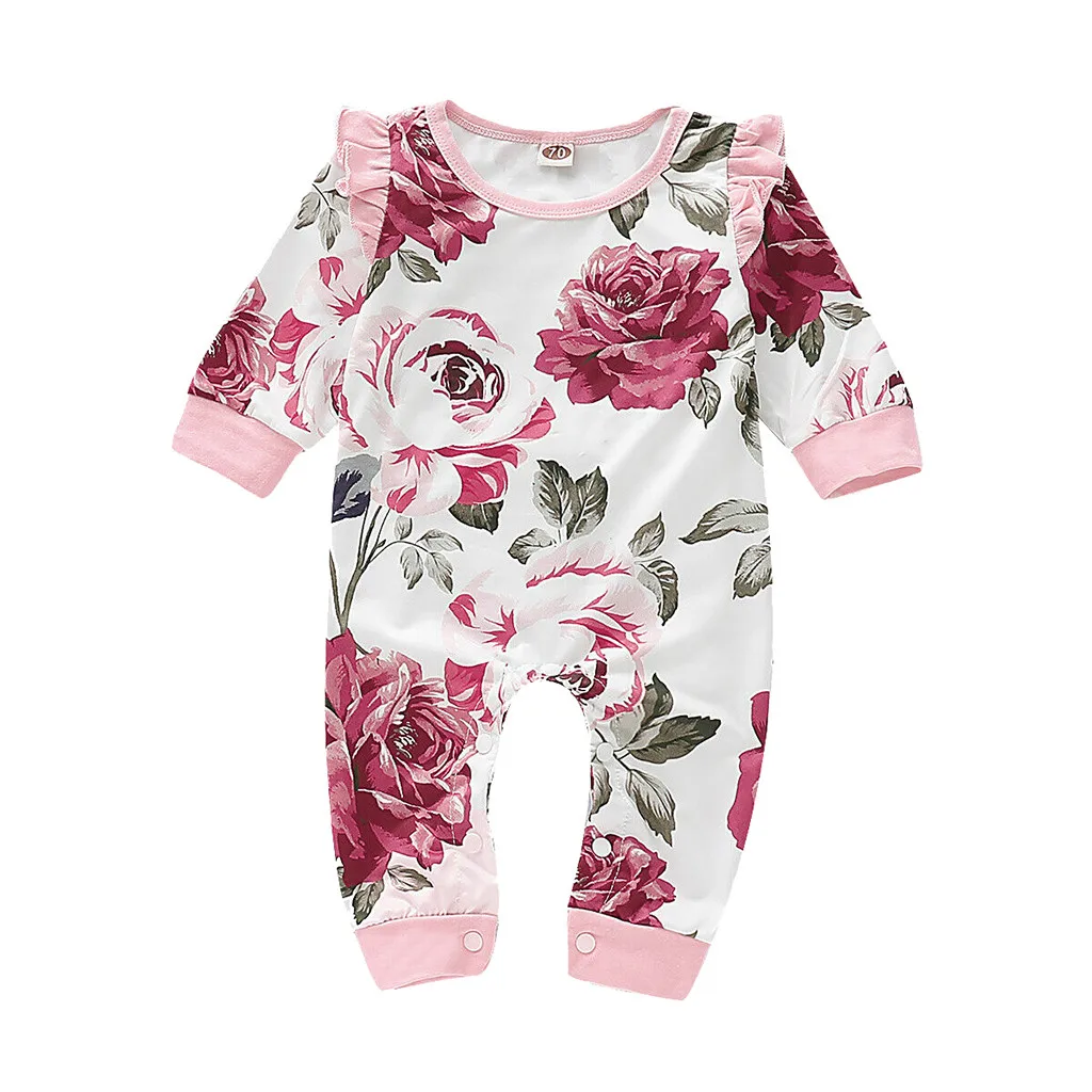 Модный комбинезон для новорожденных девочек с длинными рукавами и оборкамиС воланомМягкий теплый комбинезон с цветочным принтом на пуговицах; Одежда