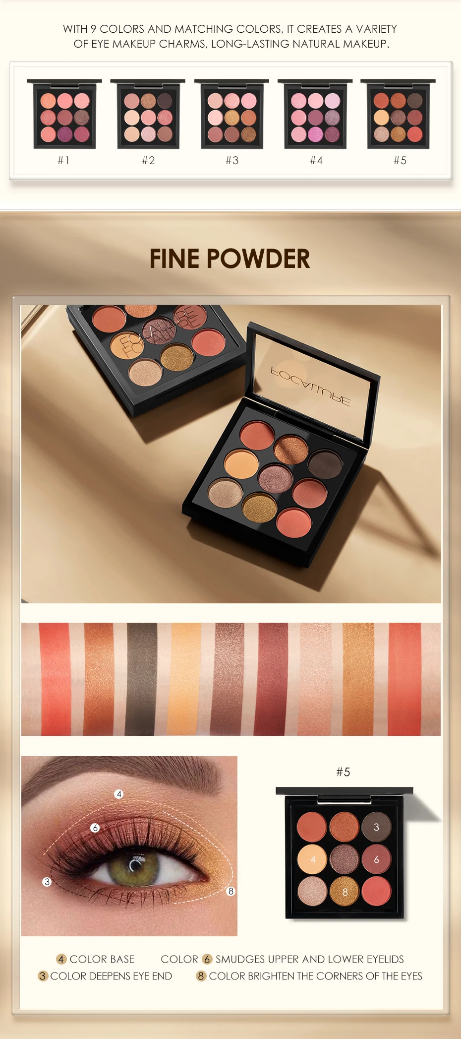 Особенности: -Создает яркие, блестящие глаза -Создает чистый оттенок для блестящего финишного слоя -Долгостойкость, сохраняет интенсивность через 8 часов -Растворение влажным способом позволяет создавать мягкие, шелковистые тени эффективно высокой концентрации. Компоненты: Тальк, полиэтилентерефталат, каприловый/каприновый триглицерид, стеарат цинка, фторопласт, сополимер этилена с акриловой кислотой, дегидроацетат натрия, феноксиэтанол, сорбиновая кислота, сополимер акрилатов, оксид олова. CI 77019 (слюда), CI 77891 (диоксид титана), CI 77491/77492/77499 (оксиды железа), CI 77000 (алюминиевая пудра), CI 75470 (кармин), CI 77510 (гексацианоферрат железа), CI 77742 (марганцевый фиолетовый ), CI 77163 (оксид-хлорид висмута). Сведения: Чистая Вес: 9g/0,31 OZ Вес: 100 г Чехол Размеры: 8 см * 8 см * 1,5 см Лицензия органа здравоохранения: GD.FDA29-XK-3276 Лицензия на производство: XK16-108 8553 Исполнительный стандарт: QB/T1976-2004 Осторожно! 1. Не использовать для других целей, кроме макияжа. 2. Избегать попадания прямого солнечного света или воздействия слишком высоких или слишком низких температур. 3. Хранить в недоступном для детей месте.