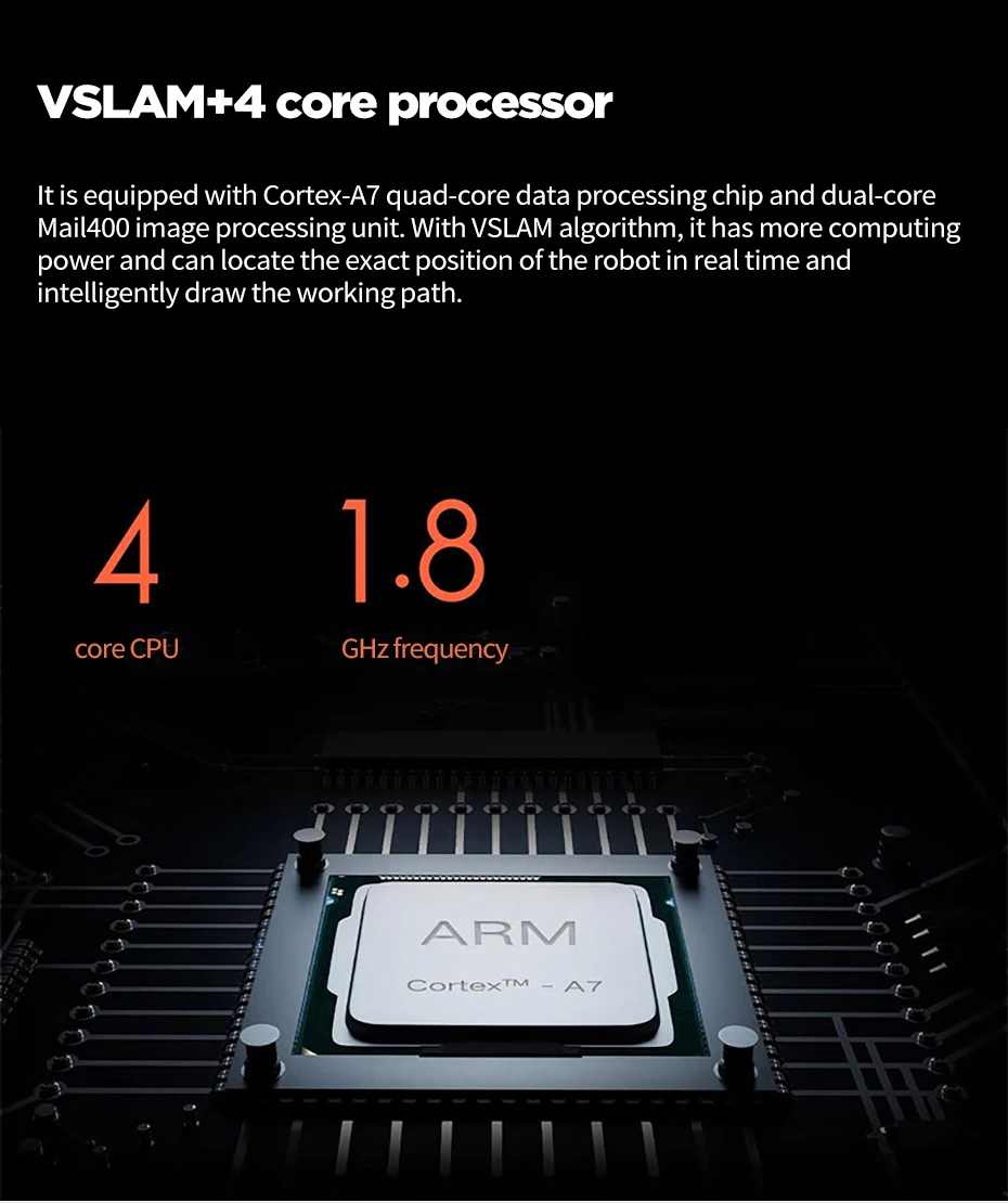 1C робот оснащен CortexTM-A7 четырехъядерный процессор обработки данных чип И двухъядерный Mali 400 блок обработки изображений. С взьем алгоритм вычислительная мощность сильнее, И точное положение робота может быть быстро расположен в режиме реального времени и уборку по может быть тянутся.
