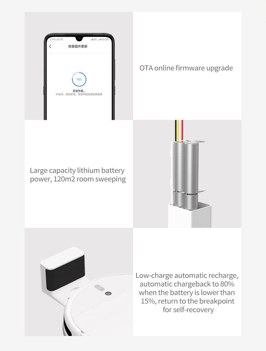 OTA онлайн обновления прошивки Постоянно обновляем обучаемости, тем больше вы используете умнее Большая емкость литиевая батарея питания 120m2 номер-подметания Низкий уровень заряда батареи, Автоматическая перезарядка В тех случаях, когда Автоматическая перезарядка сумма составляет менее 15%, Аккумулятор вернется в точку останова для самовосстановления.