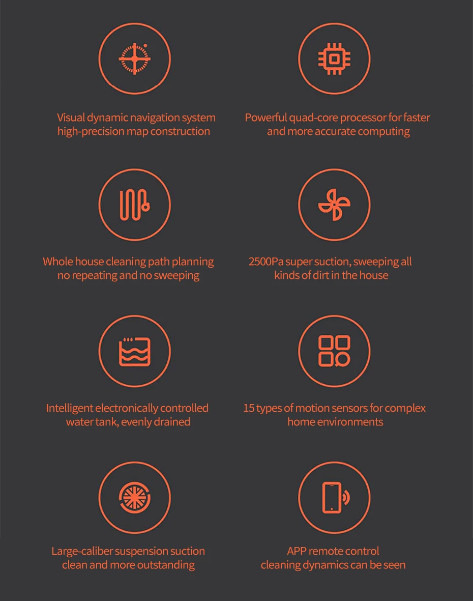 ● Визуальный динамический навигации Системы Быстрый захват координатной информации, экстракт сложной пространственной особенности, для поддержания динамической съемок во время путешествий, карта более точно и эффективно. ● Взьем + 4-х ядерный Процессор Больше вычислительной, В состоянии для того, чтобы найти точное положение робота в режиме реального времени и разумно использовать Рабочая пути. ● 200 мл резервуар для воды Точность контроля воды, мокрый перетащите является более чистым. ● 2500Pa Мощное всасывание Оснащен бесщеточным Мотором, отрегулируйте воздуховод дизайн, легко поглощают частицы пыли. ● Подвеска всасывания + Мощный основной щетки Стальная труба большого диаметра подвеска всасывающее отверстие, близко к земле. ● Высокая точность Сенсор 15 видов многонаправленная датчики, чувствительны к различных сложных условиях, легкий, чтобы избежать препятствий. ● Умный пульт дистанционного управления Управление Очистка назначение, не в домашних условиях, также можете контролировать. ● 20 мм через препятствия Легко подняться на порог, рельсы, ковровые покрытия. ● 8,2 см стройное тело Легко перейти к нижней части кровати, шкаф с выдвижными полками и диван-кровать. ● Автоматическая зарядка Автоматическая перезарядка при менее 15% заряда батареи. В тех случаях, когда батарея заряжена до 80%, вернитесь к отключения питания позиции и по-прежнему развертки.