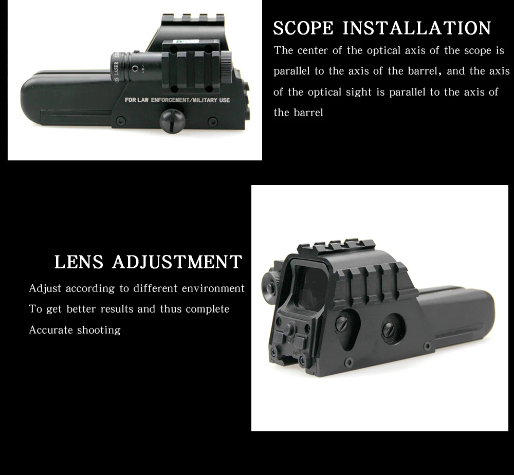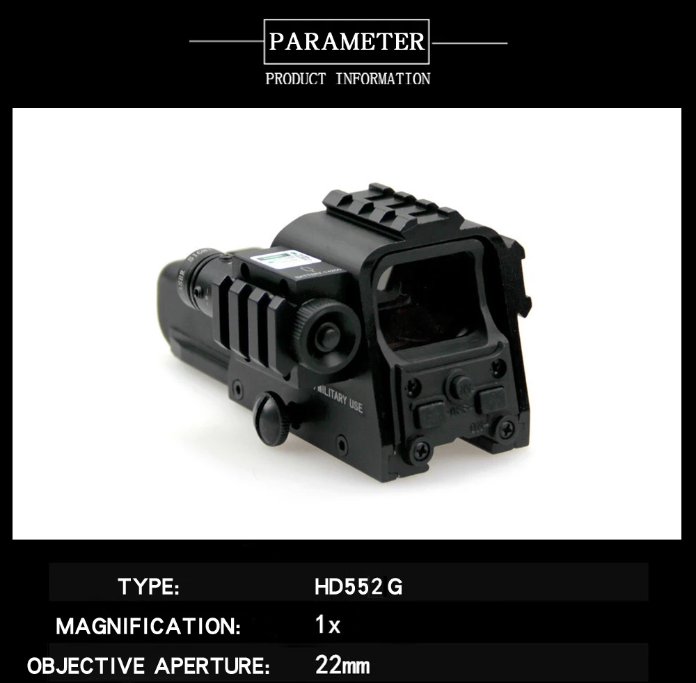 Особенности: Увеличение: 1.0x Диаметр объектива: 22 мм Длина: 137x50x61мм Поле зрения: 15,8 м @ 100 м Сетка: красный и зеленый Руководство: 22 мм