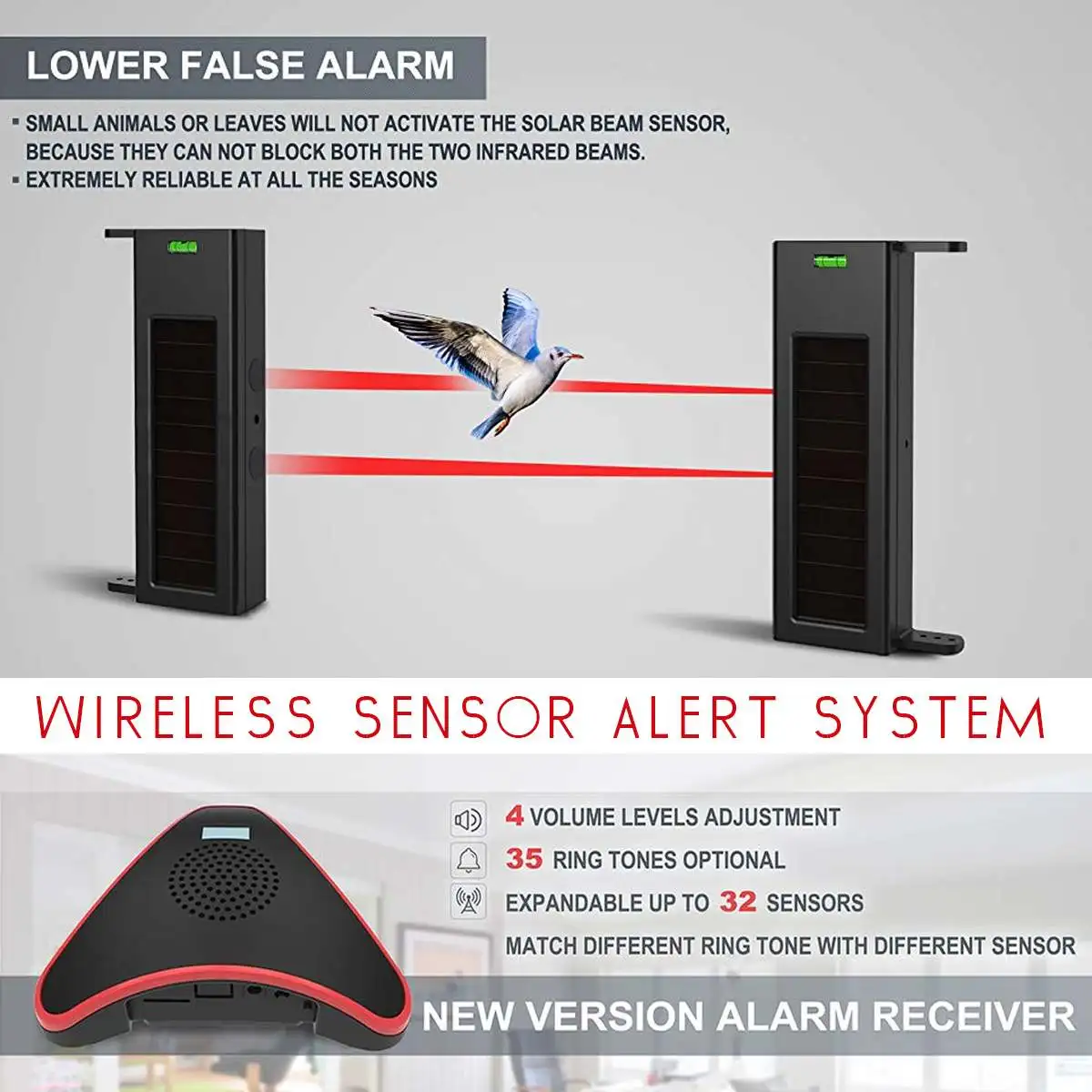 В комплект входят 1 пара солнечных беспроводных фотоэлектрических Лучевых Датчиков и 1 шт AC/Battery приведенный в действие новый приемник сигнала тревоги версии. Расширяемый до 32 датчиков и неограниченное количество приемников сигнализации для полного покрытия вашей собственности. 4 уровня громкости регулировки и 35 мелодий кольца по желанию. Сочетайте различные Мелодии кольца с разными датчиками вокруг вашего свойства, чтобы дифференцировать место обнаружения движения.