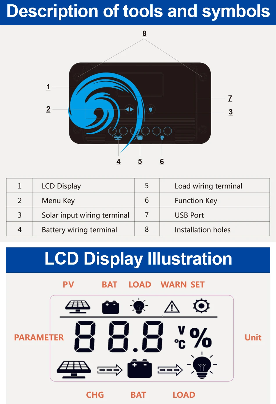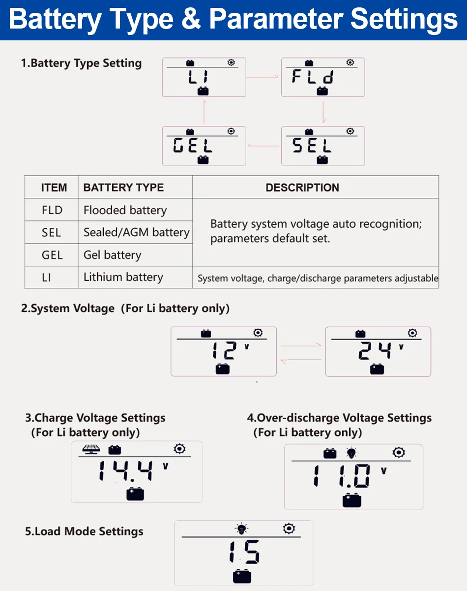 Спасибо за использование нашего продукта. Этот PWM контроллер солнечного заряда обычно является устройством для регулирования солнечного заряда и управления выходом разряда, с ЖК-дисплеем и дополнительным USB 5 В, в основном используется в малогабаритной солнечной системе постоянного тока. 1. Большинство типов батарей могут поддерживаться и выбираться, например AGM (или другой Герметичный тип), GEL, затопленный и литиевый аккумулятор (с различными настройками напряжения), с помощью кнопки в контроллере Система автоматического распознавания аккумуляторов 2,12 В/24 В для свинцово-кислотных батарей или батарей неитиевого типа 3. 3-фазная зарядка PWM: выравнивайте-Повышайте-поплавок (для затопленных AGM, свинцово-кислотных аккумуляторов типа GEL) 4. ЖК-экран, отображение состояния системы и параметров настройки 5. Удобное управление нажатием клавиш, простое и легкое. 6. Дополнительный USB-выход 5 В, подходит для мобильного зарядного устройства постоянного тока 7. Умножение выбора режима управления выходом: режим управления светом, режим управления временем освещения, режим отладки теста, ручной режим и режим всегда включенный 8. Промышленный дизайн для лучшей работы в экстремальных условиях окружающей среды 9. Полный спектр электрических средств защиты, таких как защита от подключения в PV и аккумуляторной проводке, короткое замыкание нагрузки, переразряд батареи, Превышение напряжения системы и т. д. Товар Параметры Номер модели Р2410 Р2420 Напряжение системы 12 В/24 В Авто (FLD/GEL/SLD),12 В/24 В (набор для производства литий-ионных аккумуляторов) Потеря без нагрузки 8 мА (12 В),12 мА (24 В) Максимальное входное напряжение PV <55 в Номинальный ток заряда 10А 20 А Максимальная входная мощность PV 170 Вт/12 В; 340 Вт/24 В 340 Вт/12 В; 680 Вт/24 В Выбор типа батареи FLD Сель Гель Ли Выравнивать напряжение заряда 14,8 в × Н 14,6 в × Н -- -- Повышающее напряжение заряда 14,6 в × Н 14,4 В × Н 14,2 В * Н 14,4 В × Н (регулируется) Плавающее напряжение заряда 13,8 В × Н -- Усиление напряжения для восстановления заряда 13,2 В × Н -- Напряжение восстановления при превышении разряда 12,6 в × Н 12,6 в × Н (Автоматическая настройка напряжения при превышении разряда) Напряжение разряда 11,1 В × Н 11,1 × N (регулируется) Регулятор напряжения светильник 5 В (12 В система),10 в (24 В система) Время задержки светильник том 10 с Режимы нагрузки Управление светом (От заката до рассвета) светильник + времени, режим отладки, ручное управление, Режим постоянного включения. Рабочая температура -25 ℃ ~ + 65 ℃ Защита IP IP30 Вес нетто 180 г 200 г Связь На Дисплей ЖК-дисплей Высота работы ≤ 3000 м Размер контроллера (мм) 122 × 70 × 34,5