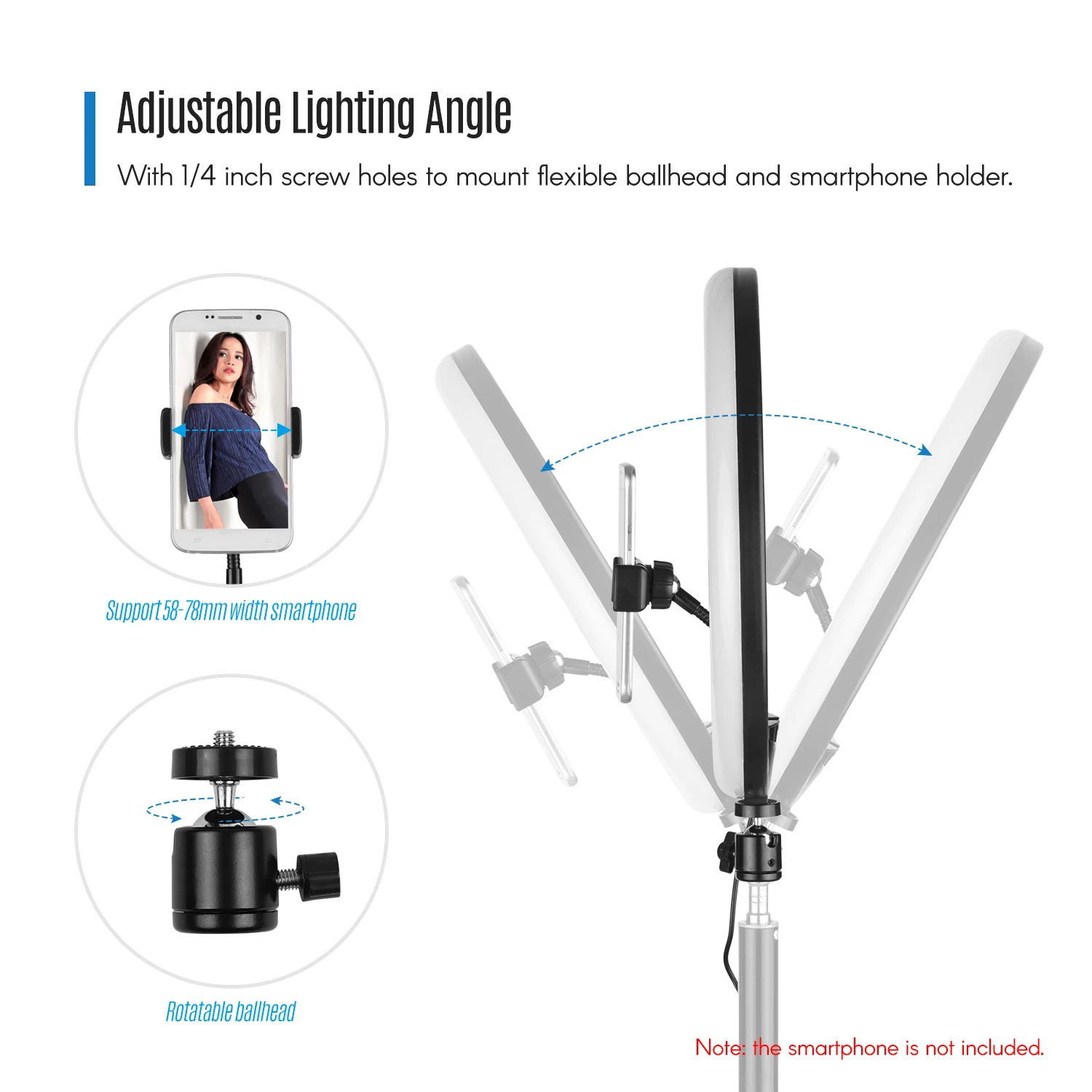13 дюймов светодиодный кольцевой светильник оборудована одним шариковая головка для легкой регулировки светильник ing угол и один держатели, который может удерживать смартфон магнитных материалов с шириной от 5,8 см до 7,8 см.