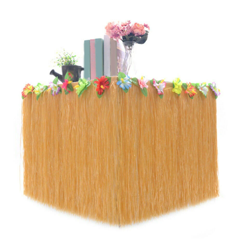 Эта юбка для стола из искусственной травы натурального цвета отделана разноцветными цветами из полиэстера и гибискуса