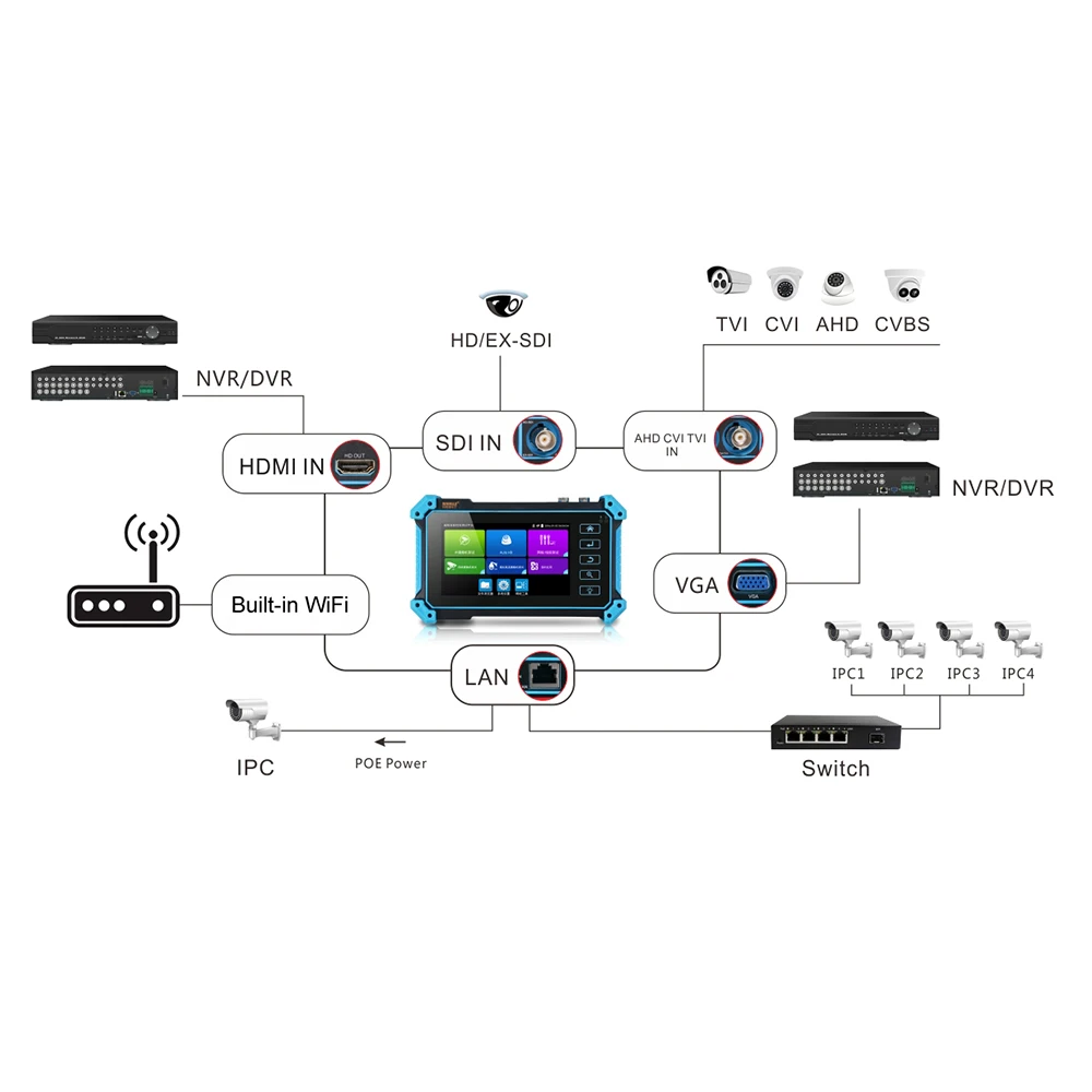 5-дюймовый IPS сенсорный экран ip-камера тестер предназначен для обслуживания и установки IP аналоговый видеорегистратор, HD коаксиальный камеры, а также другое оборудование для безопасности. Разрешение 1920*1080 позволяет ему отображать сетевые HD камеры и аналоговые камеры в высоком разрешении. Устройство поддерживает множество ONVIF PTZ и аналогового PTZ управления, и функции тестирования кабеля. Для завершения работы установщикам системы видеонаблюдения часто необходимо использовать различные инструменты тестирования. Если взять все в одном тестере камеры, делая условия работы более безопасными и увеличивая производительность.