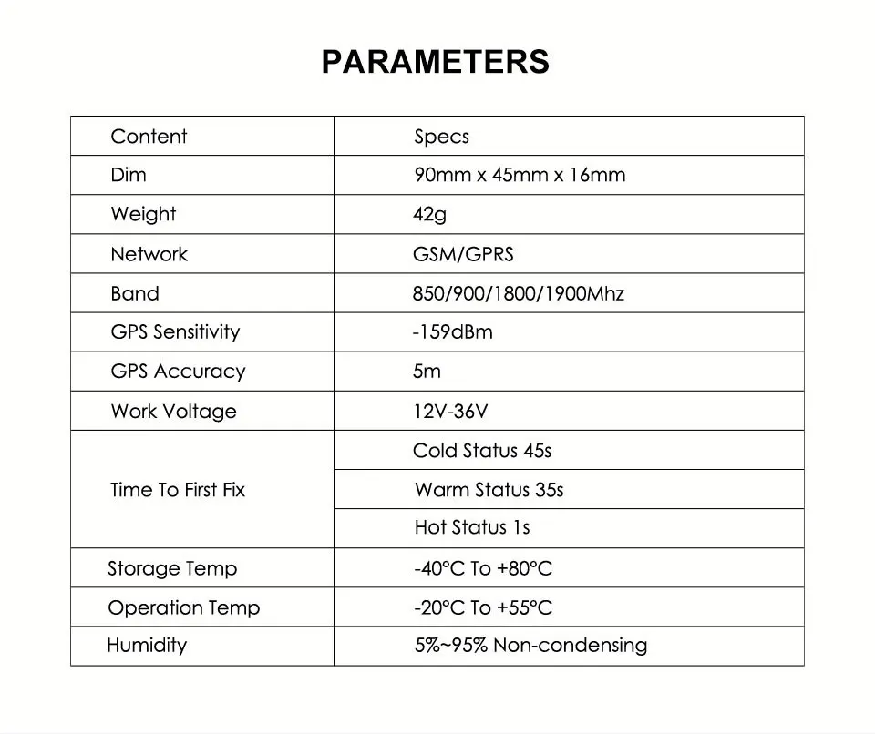 -Цвет: черный-Входная мощность: 36 В постоянного тока-Частота GSM: 850/900/1800/1900 МГц-частота GPRS: класс 2, встроенный модуль GSM TCP/IP-модуль GPS: SIRF Star III/LP - GPS каналы: 20-Чувствительность отслеживания: -159dBm-чувствительность приобретения: -144dBm-горячий запуск: <2 сек (открытое небо)-теплый запуск: <15 сек (открытое небо)-холодный запуск: <38 сек (открытое небо)-в этом устройстве будет поддерживаться sim-карта 2G, поддерживающая GPRS-Антенна: Встроенный GSM, GPS антенна с низким уровнем шума и высоким коэффициентом усиления кнопки: мощность/SOS - 3 Светодиодный индикатор: GPS-синий, GSM-зеленый, мощность-Красный-Рабочая температура: -От-10 до 60 ℃-Рабочая влажность: от 45% до 80% относительной влажности