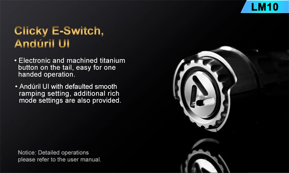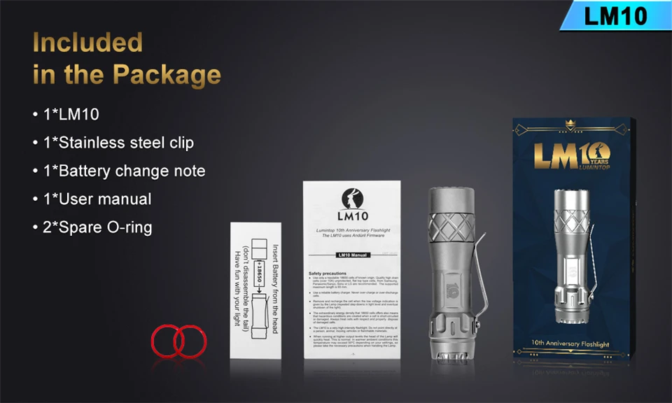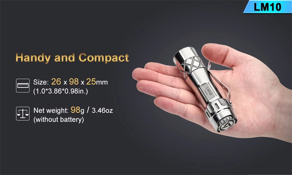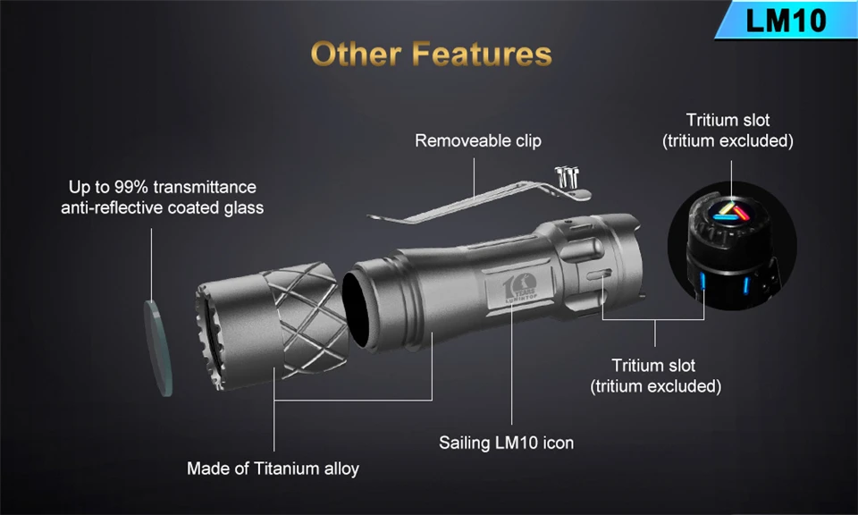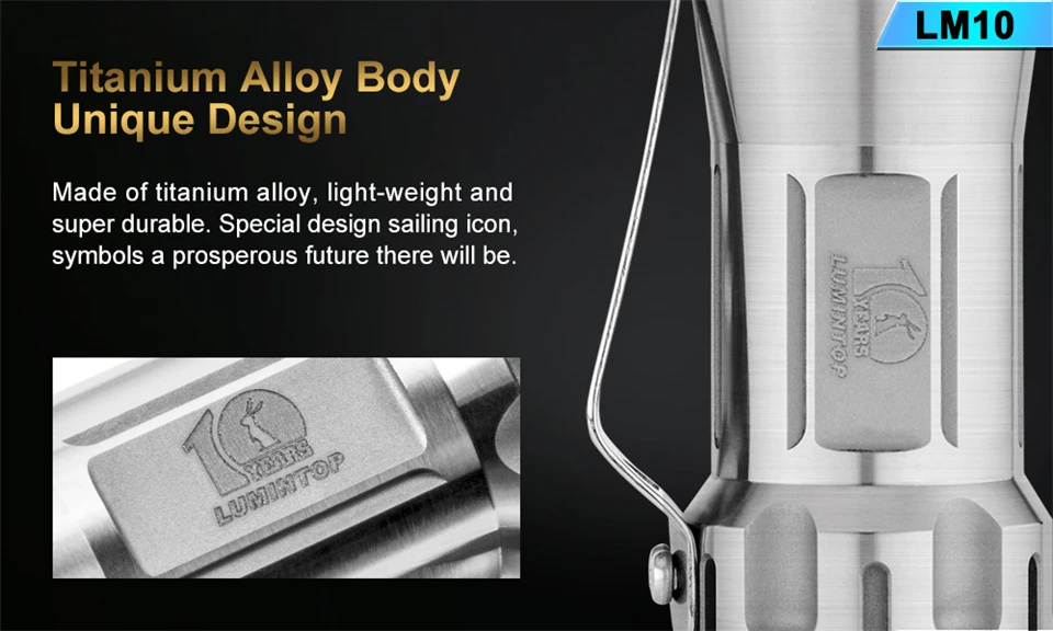 LM10-титановый фонарик, разработанный и выпущенный в честь 10-летия компании Lumintop. Изготовлен из титанового сплава, вспышка светильник Кая и суперпрочная. Уникальный дизайн формы и Фантастическая икона с юбилеем подразумевают благополучное будущее Lumintop. Фонарик применяет классический и простой в использовании пользовательский интерфейс Aduril, и он излучает сверхяркую выходную мощность 2800 люмен от трех излучателей. Водонепроницаемая защита IPX8, слоты для трития, LM10 более воспроизводима и это идеальный выбор как для ежедневного использования, так и для коллекции и т. Д.
