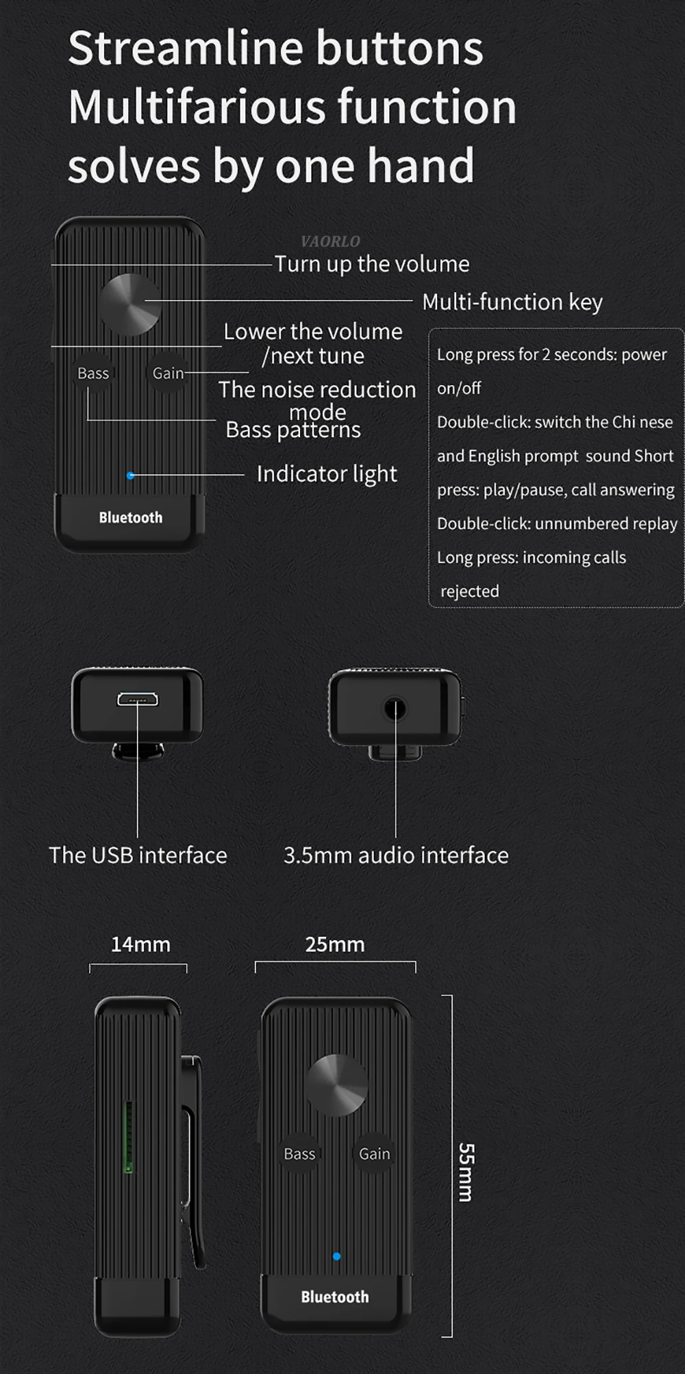 1. Поддержка басового режима 2. Поддержка режима подавления шума 3. Со съемным задним зажимом 4. Поддержка воспроизведения TF-карт 5. Передача стереозвука 6. С разъемом AUX 3,5 мм 7. Поддержка регулировки громкости 8. Поддержка переключения последней/следующей песни 9. Беспроводное воспроизведение: Устранение проблем с проводным подключением, через беспроводное соединение и передачу пользователь может наслаждаться музыкой в любом месте внутри помещения с помощью беспроводного управления. 10. Широкая совместимость: Поддержка iPhone, телефонов Android и других смартфонов с функцией Bluetooth A2DP. 11. Совместим с домашними стереосистемами/динамиками, автомобильными стереосистемами, наушниками с аудиовходом 3,5 мм.