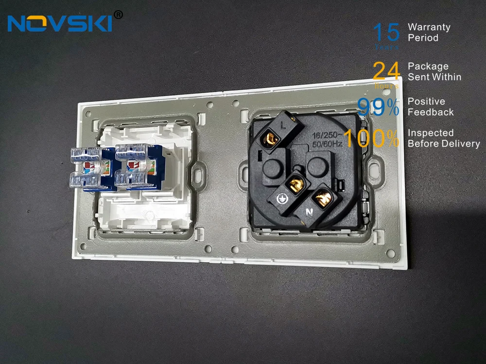 О: Да, фирменный продукт NOVSKI, который содержит Компоненты USB, гарантирует 5 лет, в то время как все обычные розетки гарантируют 15 лет срока службы. Все компоненты бесплатно заменяются за счет покупателя.