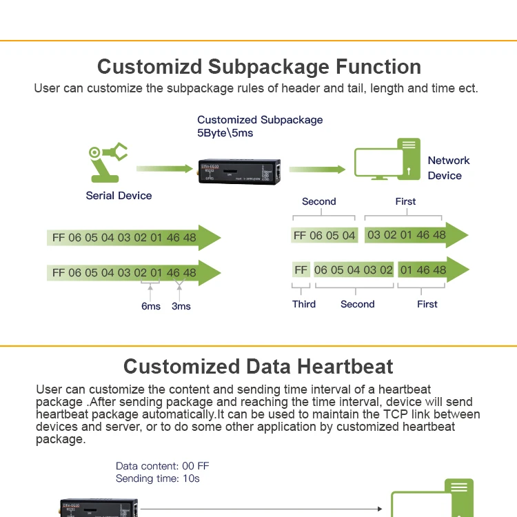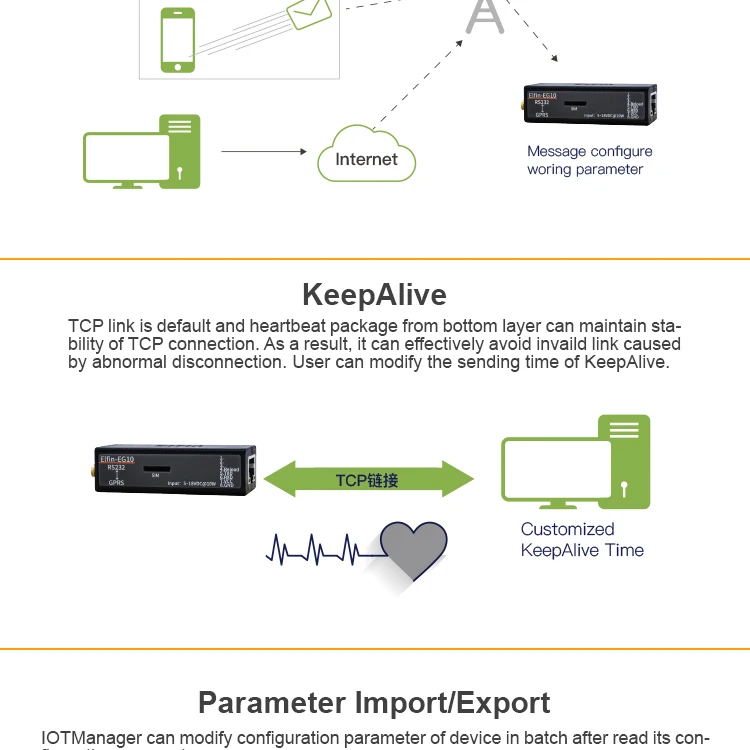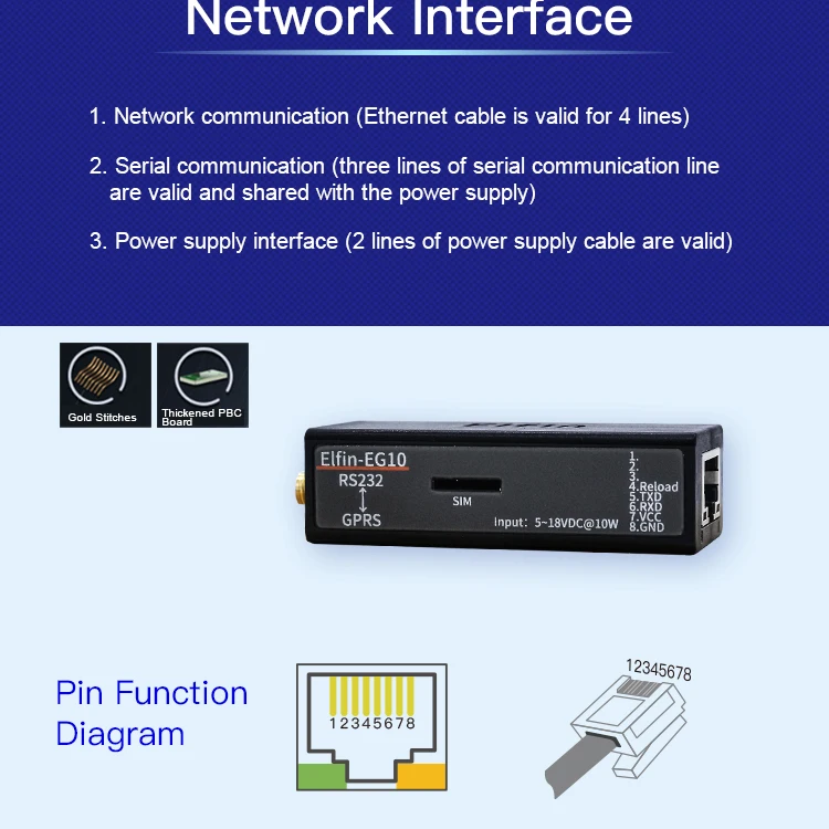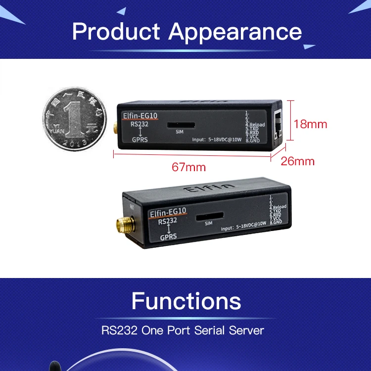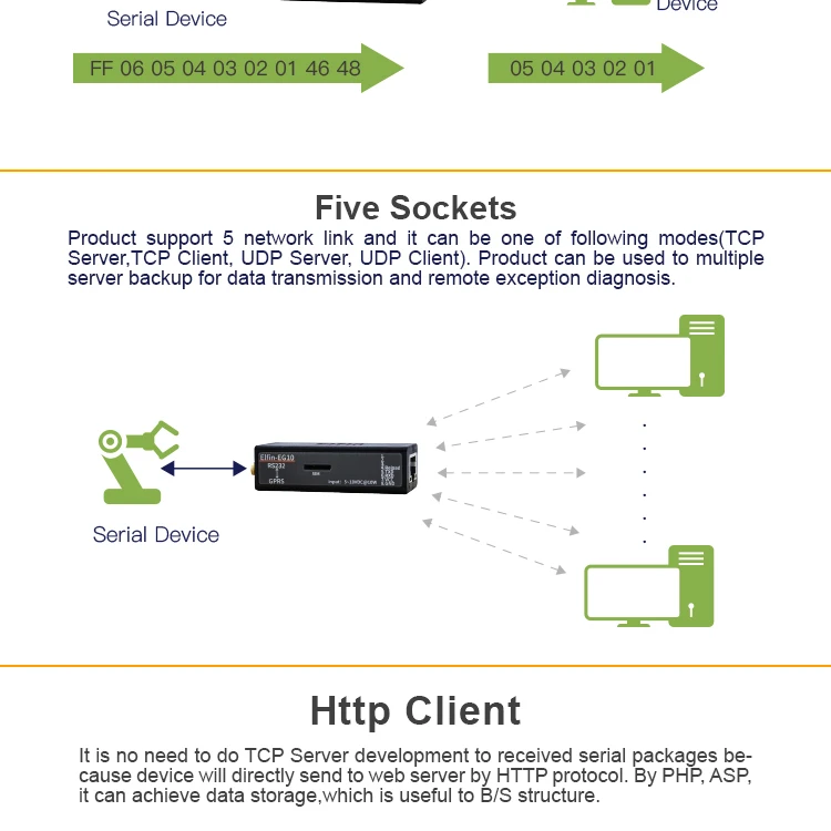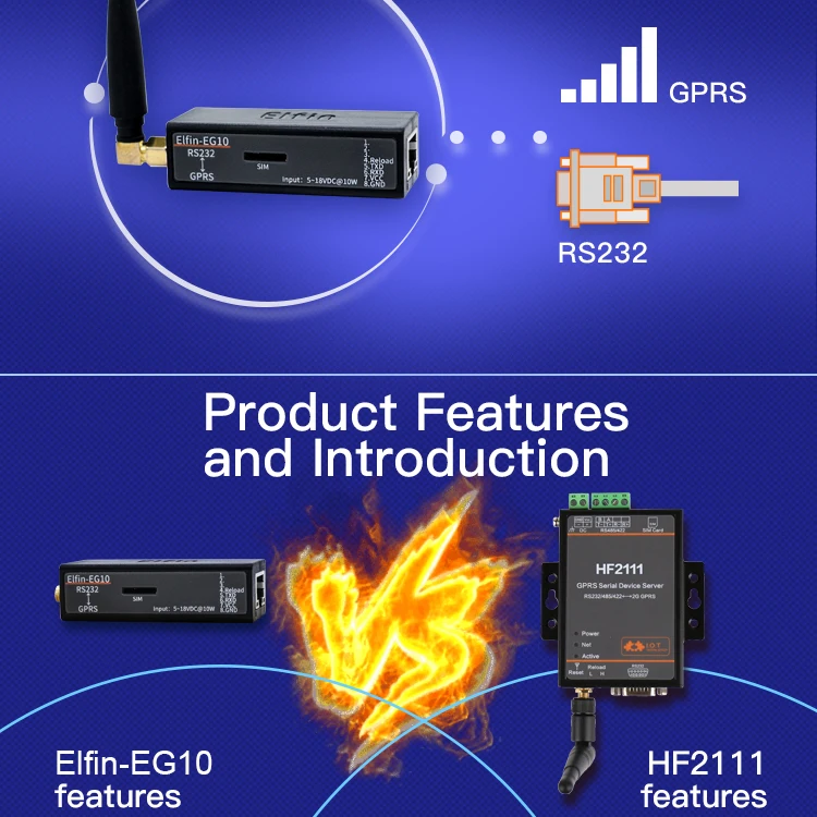 Серия Elfin-EG10 поддерживает RS232 на GPRS, Elfin-EG1X-это полное решение для последовательного порта устройства, подключающегося к сети. Это мощное устройство поддерживает надежную и проверенную операционную систему, хранящуюся во флэш-памяти, встроенный веб-сервер, полный стек протоколов TCP/IP и шифрование на основе стандартов (AES).