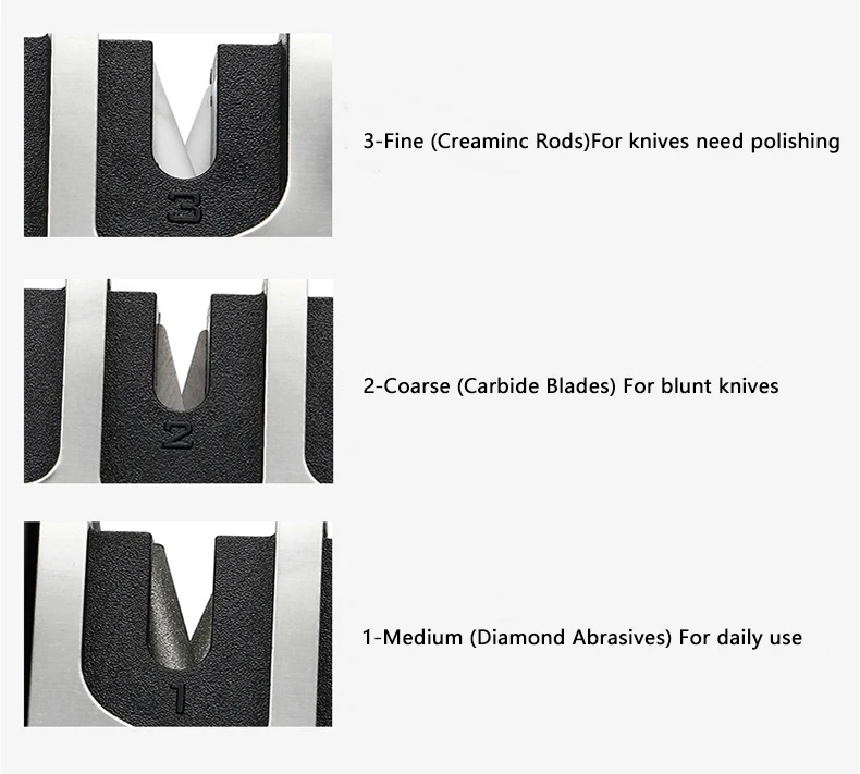 1-Средние (алмазные абразивы) для ежедневного использования 2-грубые (карбидные лезвия) для тупых ножей 3-Fine (стержни Creaminc) для ножей, требующих полировки