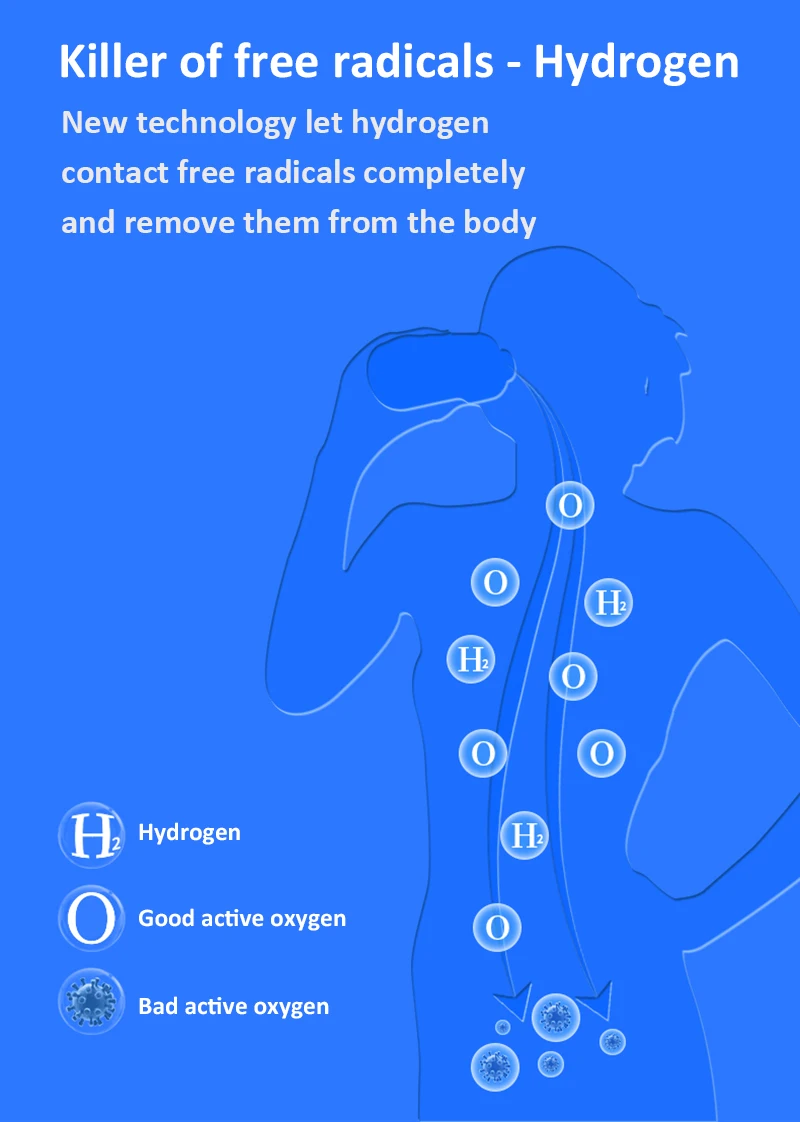 Свободные радикалы вызывают множество здоровых проблем: В организме свободные радикалы вызывают аналогичное ухудшение, так как они разрушают клеточные мембраны и делают клетки уязвимыми для распада и патогенов. Эти свободные радикалы повреждают DNA и митохондрии, Основные строительные блоки всех тканей и оставляют на своем пути множество проблем со здоровьем. Водород удаляет свободные радикалы: Растворенные молекулы водорода ищут самые вредные свободные радикалы в наших телах и нейтрализует их, прежде чем они могут сделать больше повреждений наших клеток. H2 дарит электрон и связи со свободным радикалом для создания молекулы, в которой наши тела нуждаются в H20 или воде.