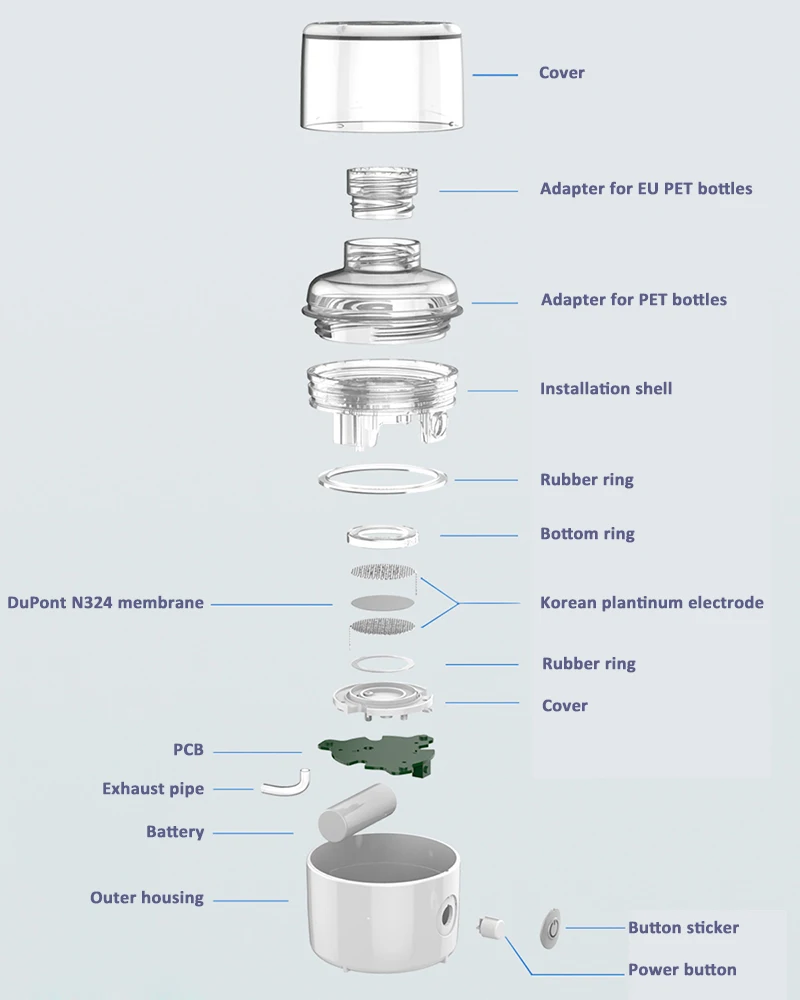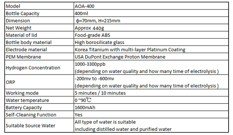 1: эстетический дизайн, красивый 2. Du Pont PEM мембрана с новейшей технологией SPE 3. Пластины электролиза изготовлены из титана с многослойным платиновым покрытием. 4. Высокое боросиликатное стекло. 5. Два режима работы, 5 минут и 10 минут 6: Режим самоочистки (также называется режимом озона), вода используется для очистки овощей для удаления пестицидов или дезинфекции. (вода из этого режима не может быть выпита) 7. Конструкция выхлопных газов, отсутствие озона, кислорода и перекиси водорода 8. Водород макс до 3300 ppb и ORP макс до-600мв (в зависимости от качества воды и сколько раз электролиза) 9. Используйте эксклюзивную технологию растворения водорода, удерживайте водород в воде 10. Нет ограничений по источнику воды, можно использовать даже дистиллированную воду и очищенную воду. 11. Оснащен простым набором для ингаляции водорода, легко вдыхать водород в любое время и в любом месте