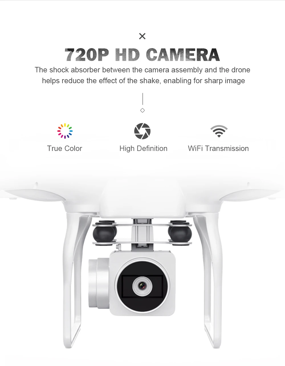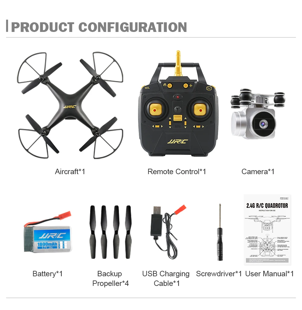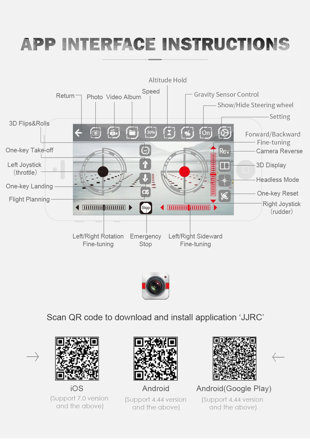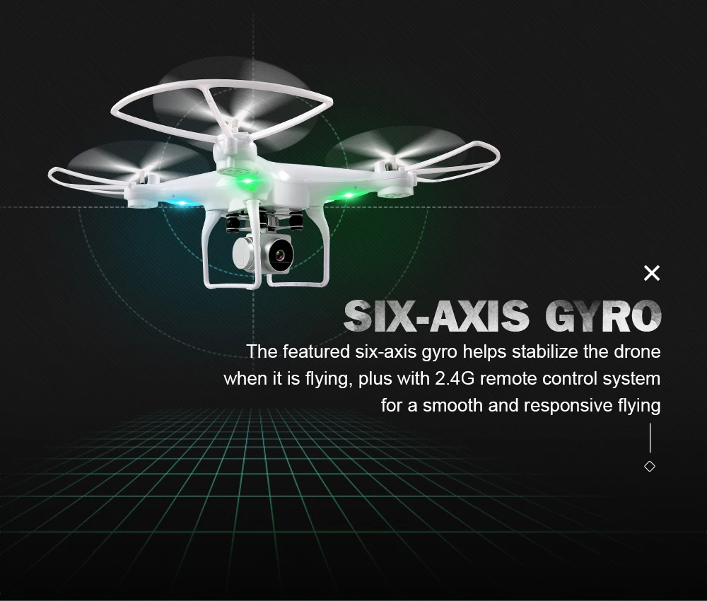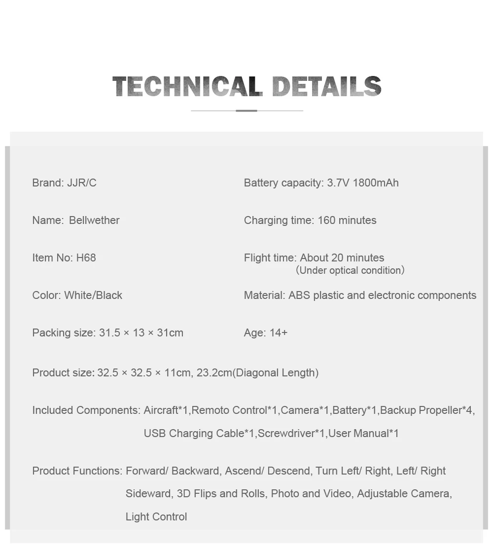 Описание Цвет: черный/белый Удаленное расстояние: около 300 м Время полета: около 15 минут (после полной зарядки аккумулятора) Время зарядки: около 160 минут Перезаряжаемая батарея: 7,4 V 850mah Передатчик Мощность: 4x1,5 V AA батарея (не входит в комплект) Камера: 1080P Размер квадрокоптера: 32,5x32,5x11 см Функция Режим удержания высоты/Безголовый режим/возврат одной кнопки Подъем и вниз/вперед и назад/влево и вправо поворот/влево и вправо полет 3D флипы и рулоны Фото и видео/регулируемая камера Светодиодный контроль Посылка в комплекте 1 x Квадрокоптер Запасной пропеллер 4x 1 отвертка 1 х Английский Мануа 1 х USB кабель для зарядки 1 x держатель для телефона 2 x Шасси