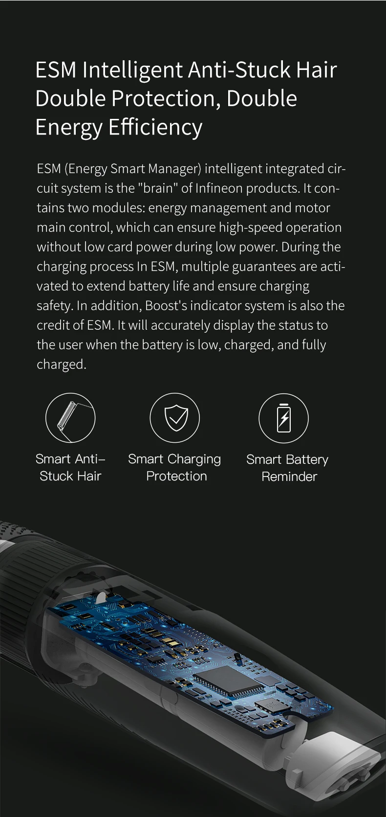 ESM (Energy Smart Manager) Интеллектуальная Интегральная система является «мозгом» продуктов Infineon. Он содержит два модуля: управление энергией и главный контроль мотора, которые могут обеспечить высокоскоростную работу без низкой мощности карты во время низкой мощности. Во время процесса зарядки в ESM активируется несколько гарантий для продления срока службы батареи и обеспечения безопасности зарядки. Кроме того, система индикаторов Boost также является кредитом ESM. Он будет точно отображать состояние пользователя, когда батарея низкая, заряжена и полностью заряжена. ● Умная защита от застревания волос ● Интеллектуальная защита зарядки ● Напоминание о смарт-батарее