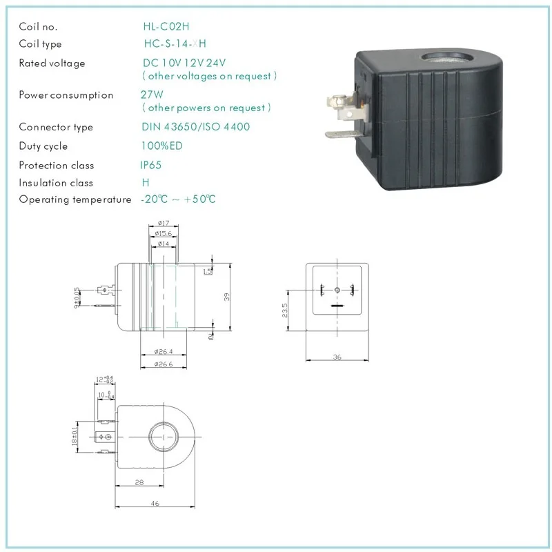 HC-S-14-H картридж электромагнитный valvevs DC 10 в 12 В 24 в DIN разъем диаметр 14 мм квадратная соленоидная катушка