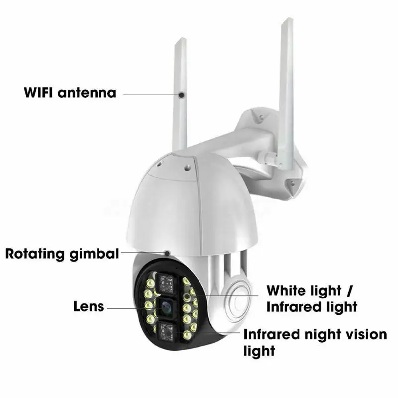 Особенности: запись звука, автоматический трекер движения, оповещения по электронной почте, инфракрасное/ночное видение, обнаружение движения, панорамирование/наклон, защита от атмосферных воздействий, широкий угол, зум, двустороннее аудио, водонепроницаемость, управление приложением, обнаружение движения PIR