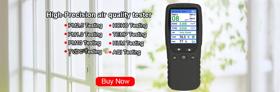 Этот продукт является многофункциональным детектором качества воздуха, который обнаруживает углекислый газ CO2, формальдегид (HCHO), общие летучие органические соединения (TVOC), частицы <2,5 микрон-размер частиц (PM2.5/1,0/10), температура и влажность с часами и функцией записи. Как научное устройство обнаружения качества воздуха, оно сочетает в себе несколько датчиков воздуха со встроенным вентилятором, что позволяет в режиме реального времени контролировать CO2 (углекислый газ), формальдегид (HCHO), общее количество летучих органических соединений (TVOC), PM2.5/1,0/10, температура и влажность на цифровом ЖК-дисплее.