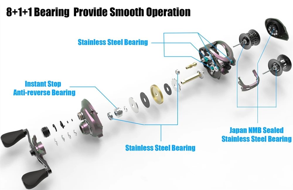 8 шарикоподшипники из нержавеющей стали + 1 нержавеющий роликовый подшипник + 1 дополнительный катушечный подшипник обеспечивает плавную работу (2 + 1 корпорация NMB, Япония в комплекте)
