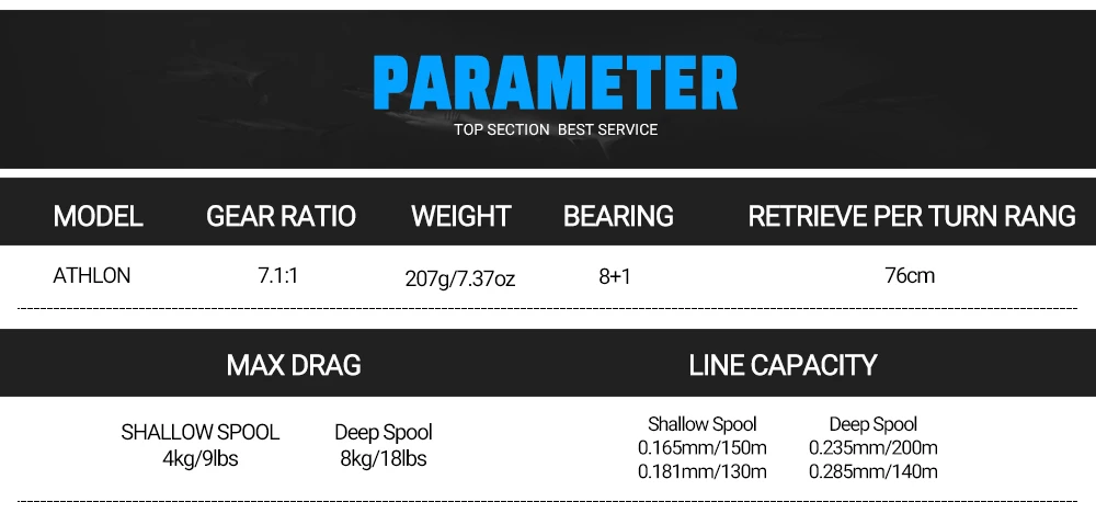 Информация о товаре: ATHLON | Передаточное отношение: 7,1: 1 | Вес: 207 г | Вес катушки: 11 г (мелководье катушка) 18 г (глубокая катушка) | Подшипники: 8 + 1 + 1BB | Максимальное сопротивление: 4 кг (мелководье катушка) 8 кг (глубокая катушка) | Емкость лески (мелководье катушка): 0,165 мм/150 м 0,181 мм/130 м | Емкость лески (глубокая катушка): 0,235 мм/200 м 0,285 мм/140 м | Извлечение на разворот: 76 см| Вес приманки: 1,5-15 г (мелководье катушка) 3-30 г (глубокая катушка)