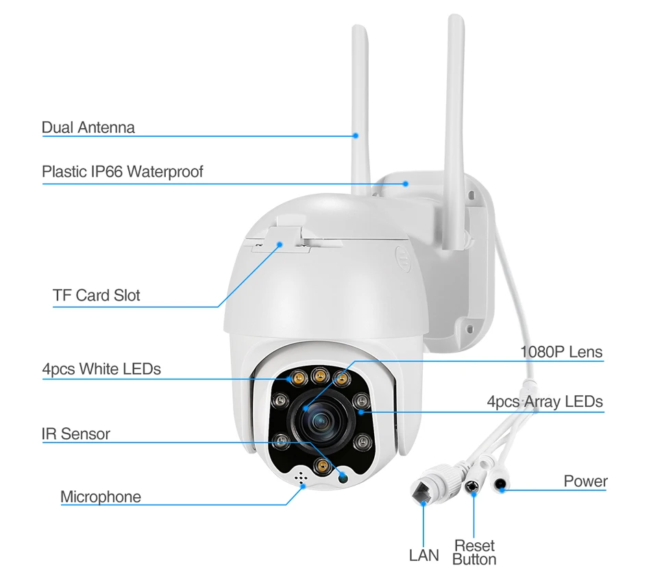 Когда кто-то ворвется в область съемки, камера сделает звуковой сигнал и сигнал тревоги будет передвинут в приложение вашего телефона. И когда он обнаруживает движение, 4 белый светодиодный светильник s будет светильник, показывая вам цвет ночной сцены.