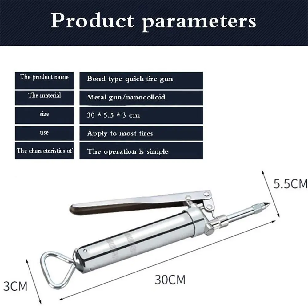 Пистолет для ремонта автомобильных шин, ручной инструмент, длинная полоса, быстрый инструмент для ремонта, нано коллоидный пистолет, вакуумный пистолет для ремонта шин Применимый диапазон: этот инструмент для ремонта шин является мощным и некоррозионным и может быть применен к большинству моделей. Нано коллоидный пистолет для шин: нано-коллоид химически реагирует с резиновой шиной, чтобы прочно адсорбировать резиновую шину, достичь мощного эффекта ремонта шин. Простота в эксплуатации: Этот набор для ремонта автомобильных шин прост в использовании, нет необходимости в установке, просто нажмите на пресс-пластину и используйте. Высокая погрешность: Водонепроницаемость и высокая температура, независимо от того, являетесь ли вы горным или приливным болотом, он не будет легко деформироваться. Легкий и портативный: маленький размер и легко носить с собой, не занимает места, независимо от того, находитесь ли вы за рулем или за рулем в городе, необходимо принести наши инструменты для ремонта шин, экономит вам много расходов на ремонт автомобилей.
