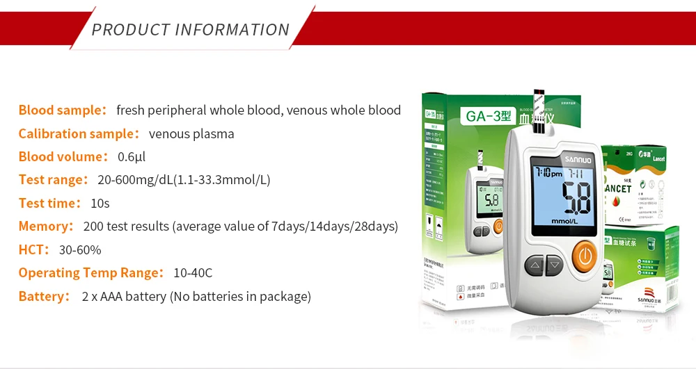 Sinocare GA-3 измеритель уровня глюкозы в крови с Тесты полоски и Ланцеты сахара в крови, медицинский измеритель уровня сахара в прибор для контроля уровня сахара в крови при сахарном диабете Тесты er с английским языком краткое руководство Для пульта дистанционного управления 1. батарейки не прилагаются в комплект из-за ограничений в области авиаперевозок. 2. пожалуйста, используйте тест-полоски в течение 3 месяцев после открытия флакона. 3. это устройство поддерживает только показания в ммоль/л, единица измерения может быть не конвертирует показания в мг/дл. 4. Срок годности тест-полосок-до 2022. 5. Упаковочная коробка была изменена к красной коробке, а не зеленый коробка больше.