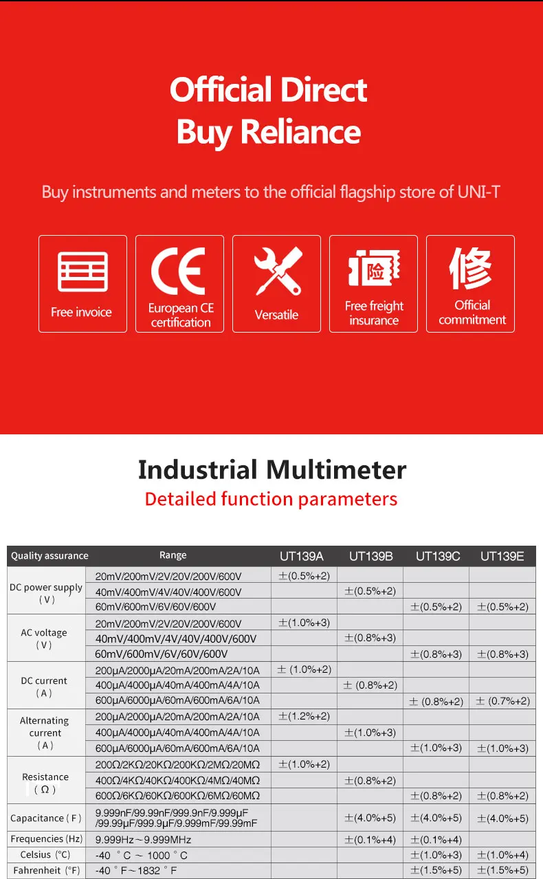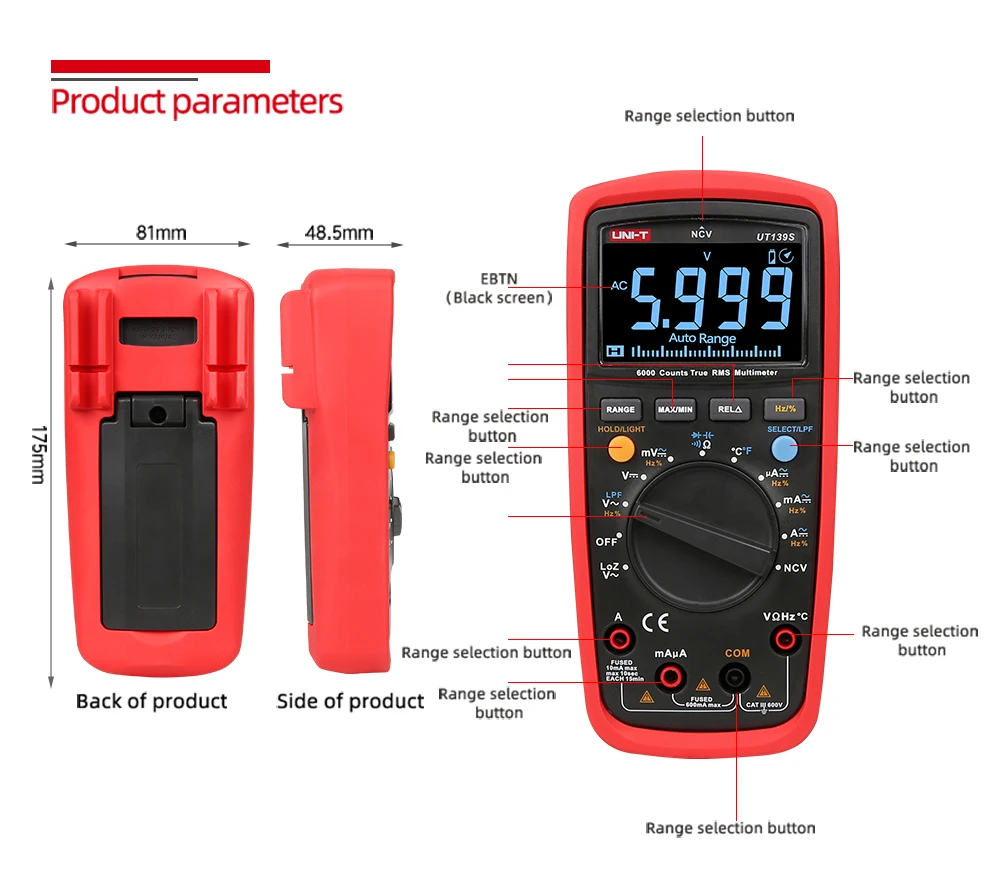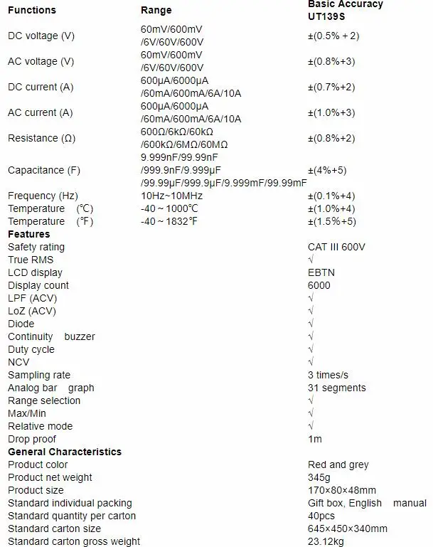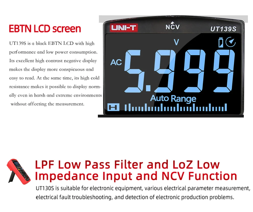 Серия UT139-Цифровые мультиметры CAT III, 600 В, предназначены для электриков. Ее функция NCV может эффективно проверять электрическое состояние, измеряя интенсивность области EM. Новые модели UT139E/S имеют специальные функции, такие как LoZ (ACV) для измерения напряжения Ghost. Его встроенный 31 в поп упаковке, аналоговая панель также дает электрики лучшее визуальное отображение результатов измерений. UT139S имеет черный дисплей EBTN, который идеально подходит для работы в темных условиях.
