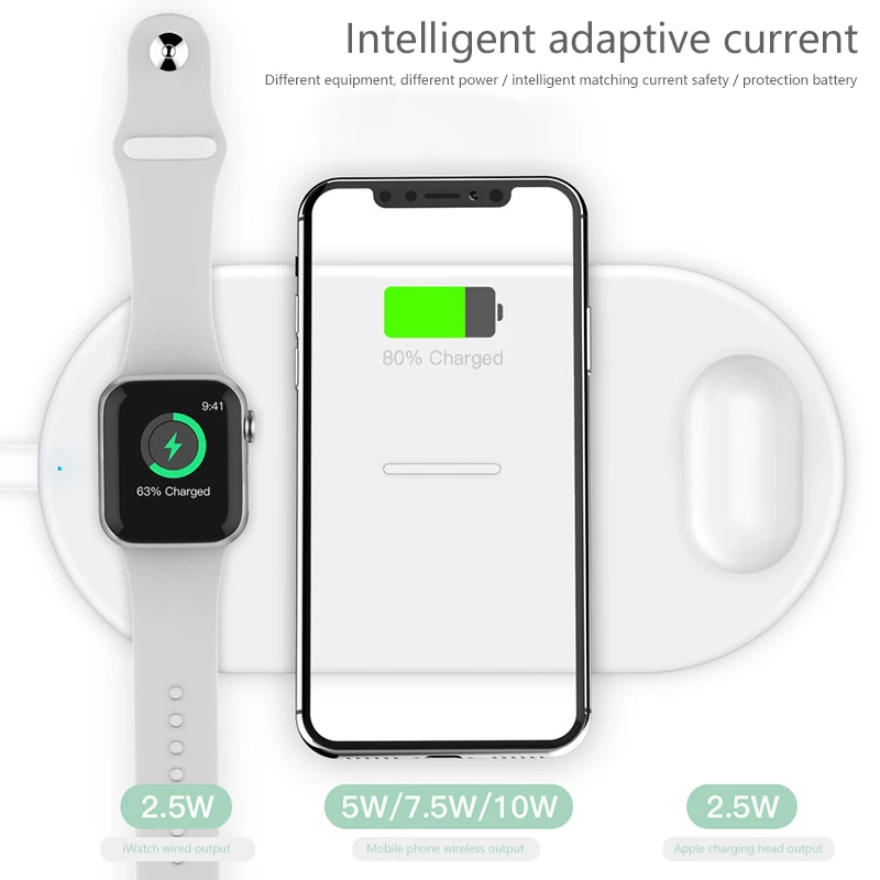 Примечание: зарядное устройство для iWatch не включено Параметры: Стандартный: QI Вход: 9V/1.67A или QC 2,0-3,0 Частота зарядки: 110-205 кГц Мощность: 5 Вт 7,5 W 10W Выход USB: 5 В/1 А Llghtning :5V /1A Эффективность зарядки: 80% Макс. Расстояние зарядки: 8 мм Макс. Вес изделия: 95 г Размеры: 174x88x9.5mm