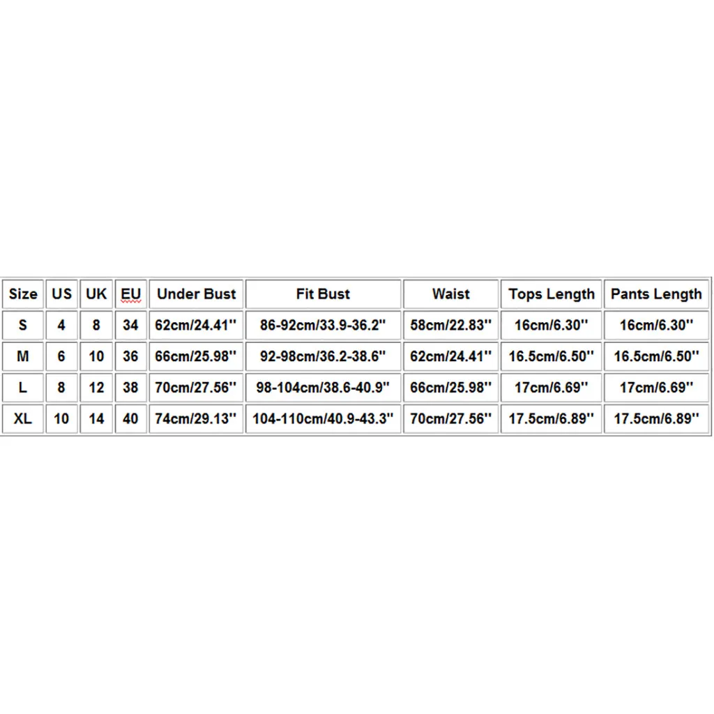 Размеры Свяжитесь с нами Великобритания ЕС Обхват под грудью Обхват груди Обхват талии Топы Длина Брюки Длина S 4 8 34 62 см/24,41'' 86-92 см/33,9-36,2" 58 см/22,83'' 16 см/6,30'' 16 см/6,30'' М 6 10 36 66 см/25,98'' 92-98 см/36,2-38,6" 62 см/24,41'' 16,5 см/6,50'' 16,5 см/6,50'' L 8 12 38 70 см/27,56'' 98-104 см/38,6-40,9" 66 см/25,98'' 17 см/6,69'' 17 см/6,69'' XL 10 14 40 74 см/29,13'' 104-110 см/40,9-43,3" 70 см/27,56'' 17,5 см/6,89'' 17,5 см/6,89''