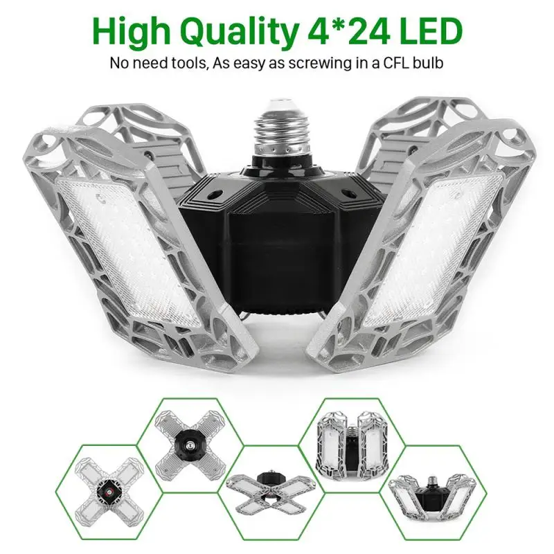 -Супер яркий светодиодный гараж светильник-с 4 Ультра-яркая подсветка с Регулируемый алюминиевый светодиодный головок-это особенности светодиодный технологии с 4*24 шт. наивысшего качества диоды для подавления переходных скачков напряжения, что общий объем 12000 люмен, таким образом, CRI80 +, дневный светильник 6000K для вашего гаража, обеспечивающий лучший Домашний Светильник с опытом работы.