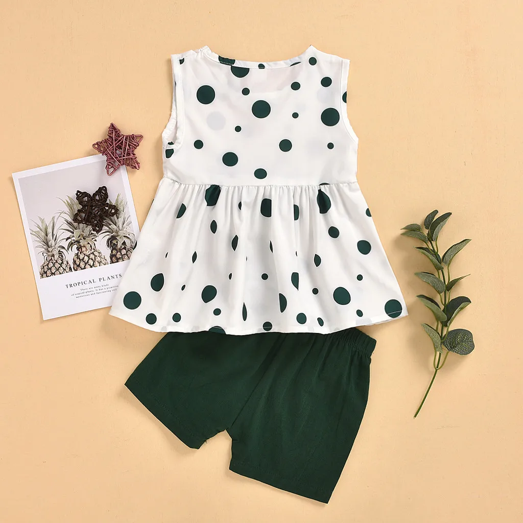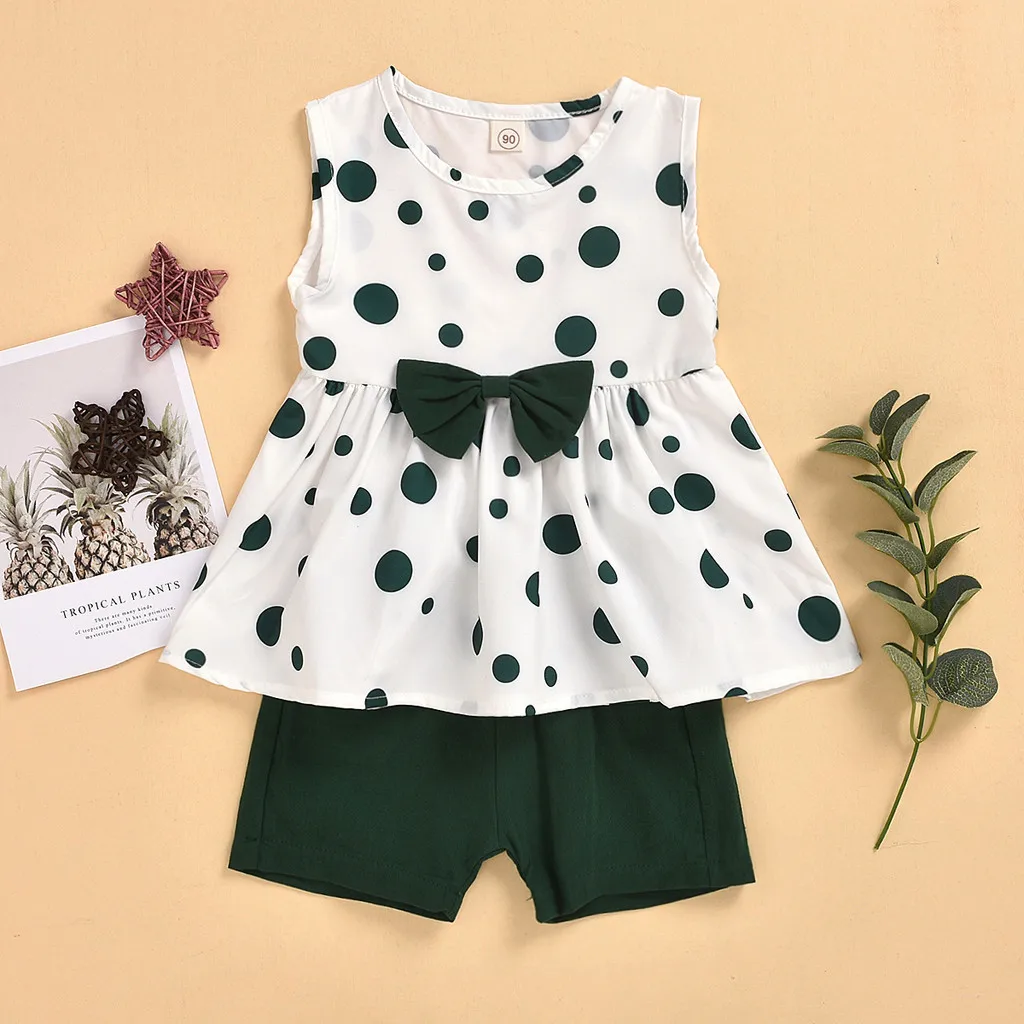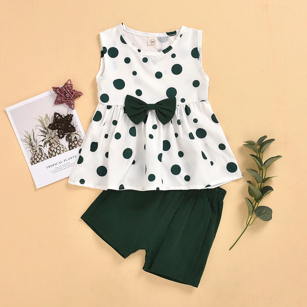 Топы без рукавов в горошек с бантом для маленьких девочек + однотонные шорты, комплект одежды