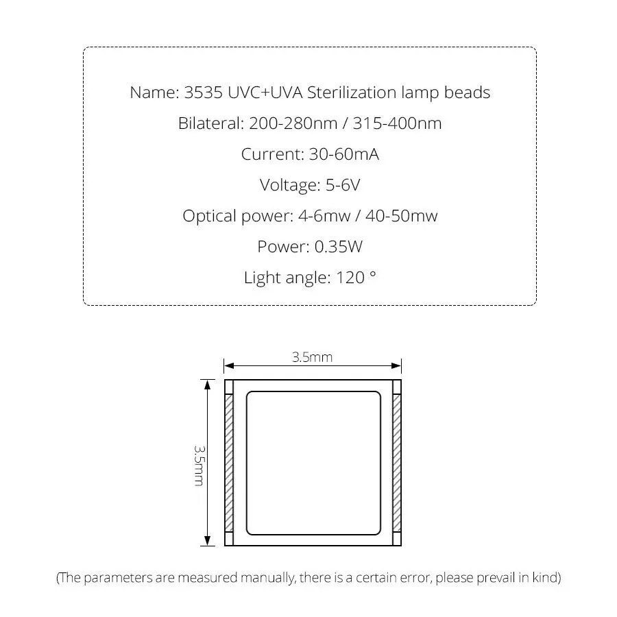 Светодиоды DUV излучают ультрафиолетовый светильник, который может быть вреден для кожи и глаз. Избегайте прямого или отраженного воздействия на УФ-светильник, когда светодиодный индикатор работает.