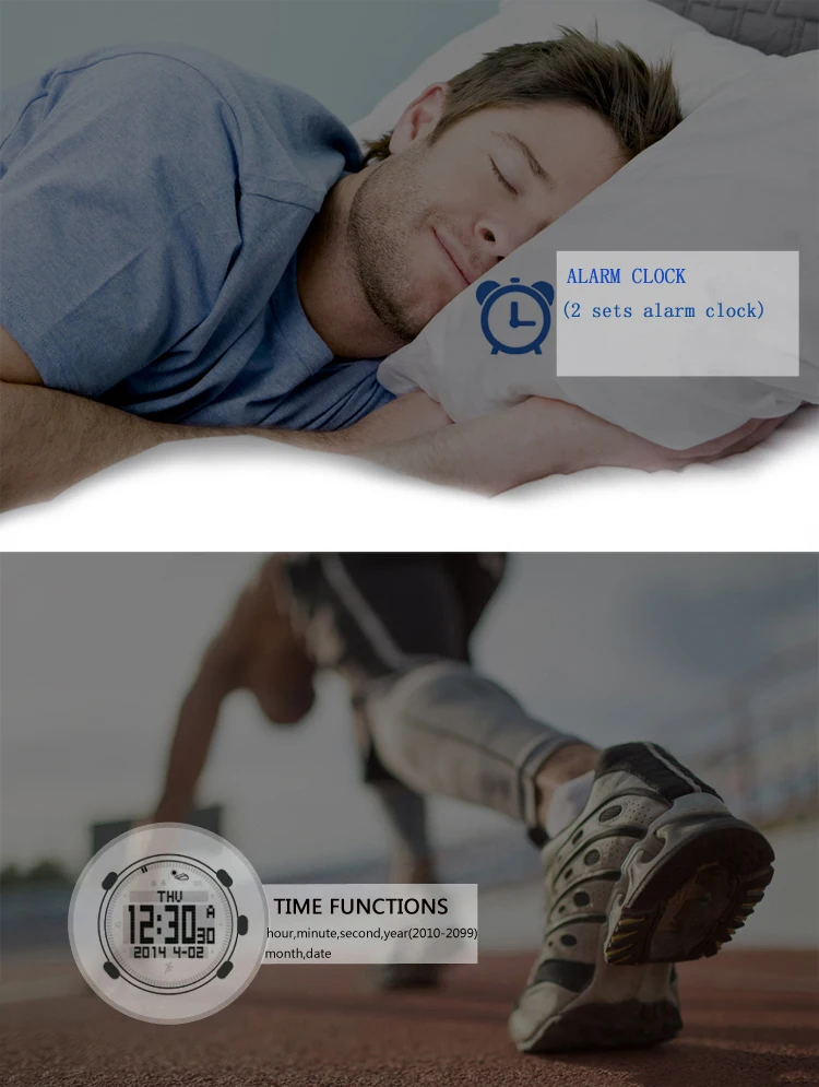 ● Функции времени: час, минута, секунда, год (2000-2099), месяц, дата, будний день, 12 ч/24 ч ● Будильник (2 комплекта будильника, ежечасный будильник) ● Таймер обратного отсчета (99:59:59 ~ 0) ● Секундомер (0 ~ 99:59:59), 11 наборов данных ● Шагомер, счетчик шагов, калории, запись расстояния ● Цифровой компас, высотомер, барометр, термометр, тренд давления воздуха и тренд высоты ● Тренд давления воздуха в течение 24 часов ● 12 часов Высота график и скорость набора высоты ● Прогноз погоды ● Мировое время (переход на летнее время автоматически) ● Кнопка включения или выключения ● Срок службы батареи ● Подсветка EL
