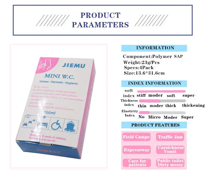■ Продукт представляет собой портативный аварийный туалет с Супер абсорбирующим отверждающим веществом и бактерицидом. Он может быстро впитывать мочу и превращаться в желатиновое вещество, чтобы избежать переливания мочи и никакого специфического запаха.