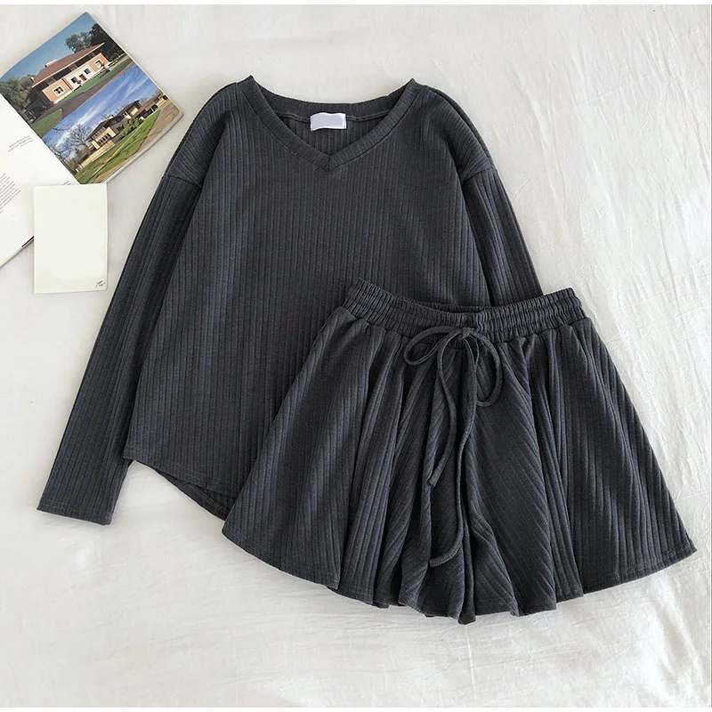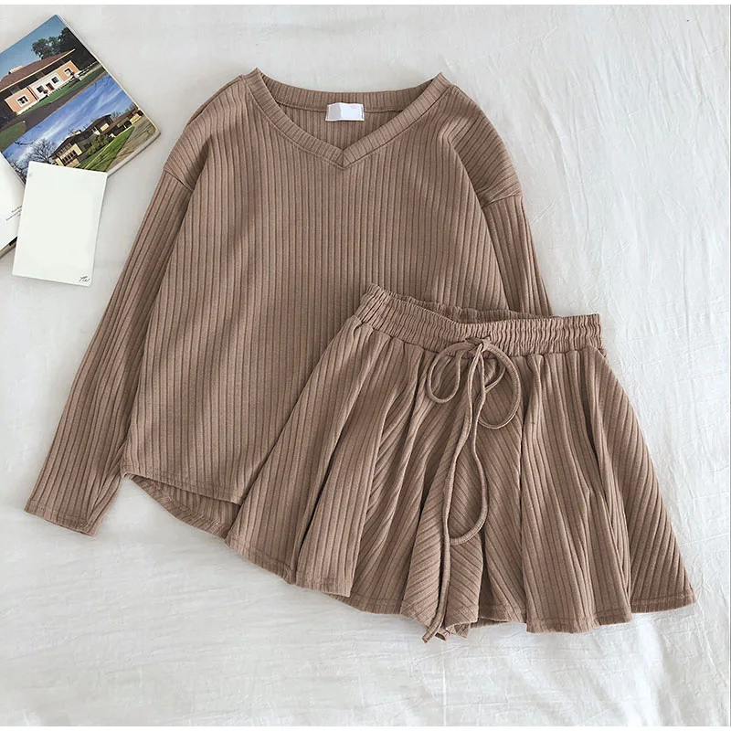 Летние женские трикотажные ребристые шорты, комплект из 2 предметов, v-образный вырез, длинный рукав, свободный женский топ, комплекты 2020, высокая талия, короткие штаны, повседневный костюм для девушек