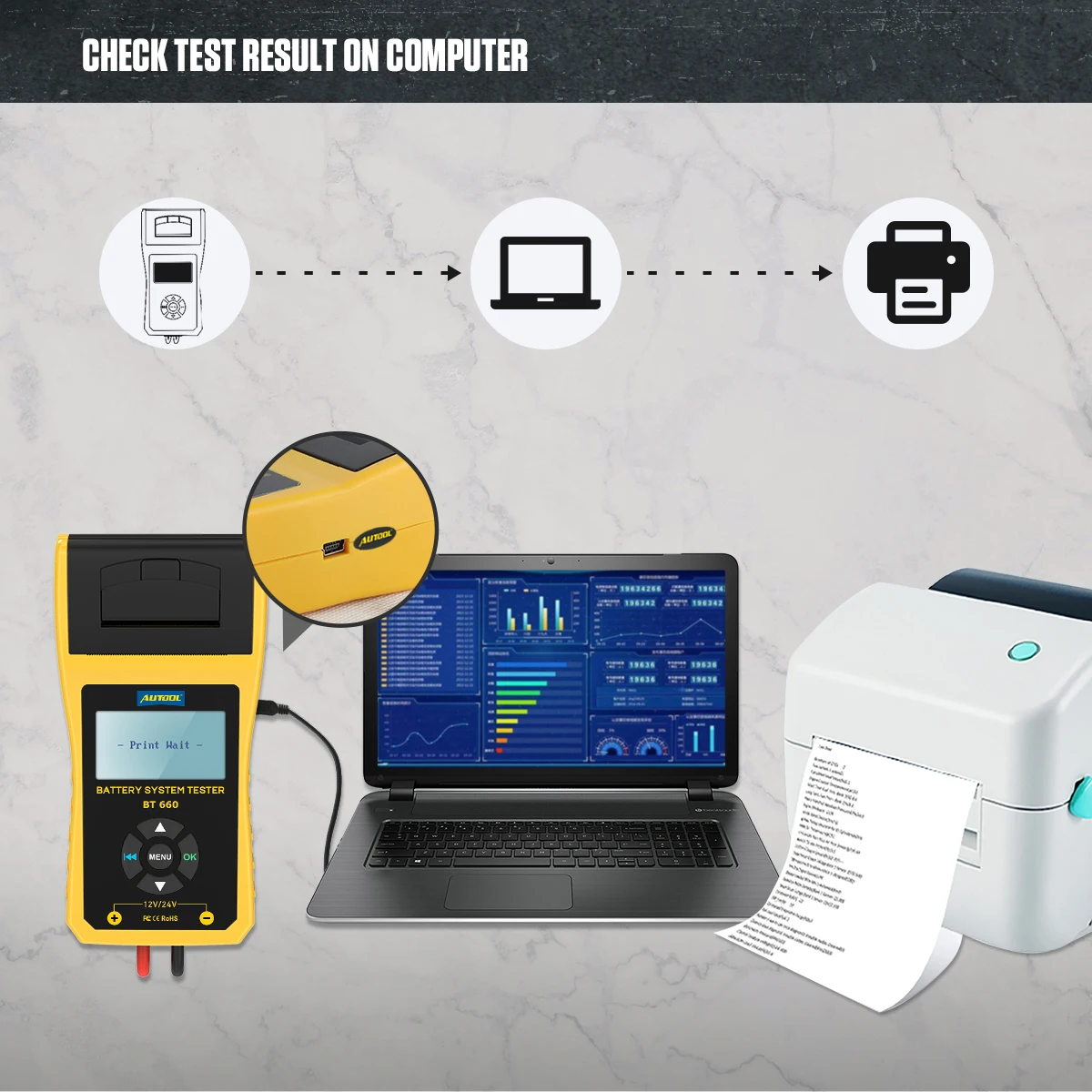 6. Экспорт данных свяжитесь с этим тестером батареи к компьютеру с линией данных, вы можете скачать программное обеспечение печати из нашей сети a t autooltech.com.