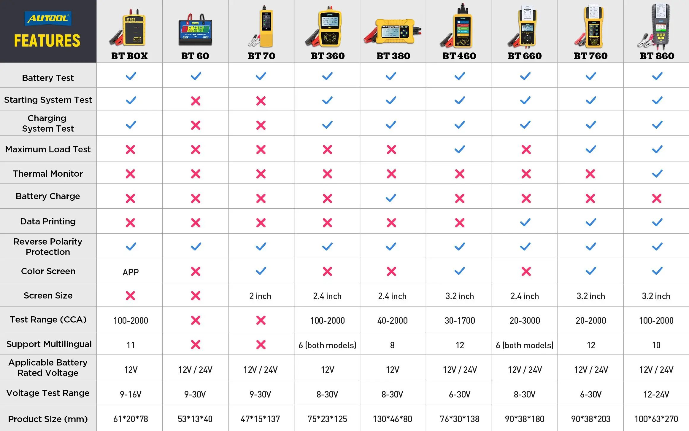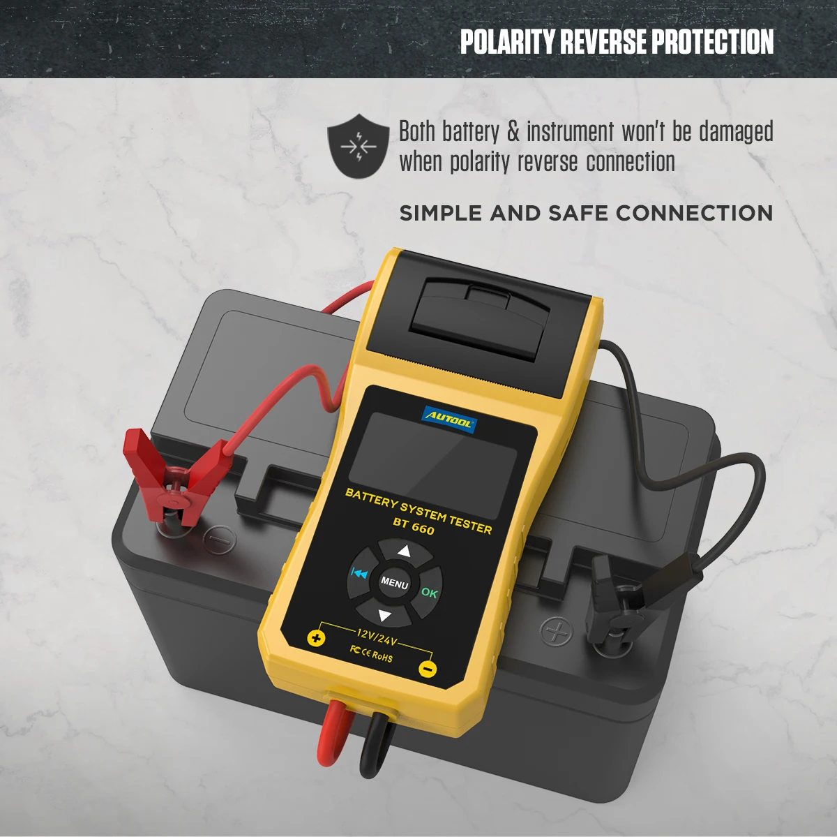 [Срабатывание при неисправности батареи]:Стандарты испытаний включают большинство стандартов батареи в мире, CCA IEC EN DIN JIS и других видов. Супер широкий диапазон pro тестер от 100 до 3000 CCA. Совместим с автомобилями, мотоциклами, грузовиками, RVs, квадроциклами, внедорожниками, лодками, яхтами, косилками и даже тележками для гольфа. С полярностью обратной защиты, аккумулятор и устройство не будут повреждены.