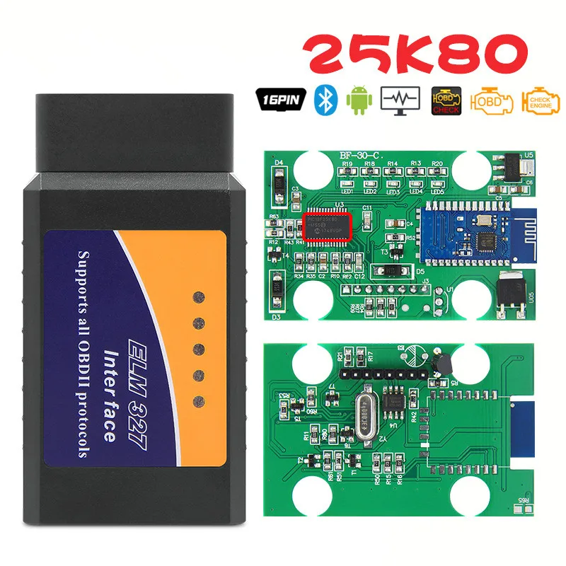 Автомобильный диагностический инструмент ELM327 V1.5 Bluetooth/WIFI OBD2 с чипом Pic18f25k80, считыватель кодов 1. Есть 3 чипа elm327 PIC18F25K80 , wifi или bluetooth, пожалуйста, внимательно проверьте его. Поддержка ATAL/ATTP/ATNL. 2. ELM327 будет работать с 12 В для бензиновых и дизельных транспортных средств требуются протоколы OBD II