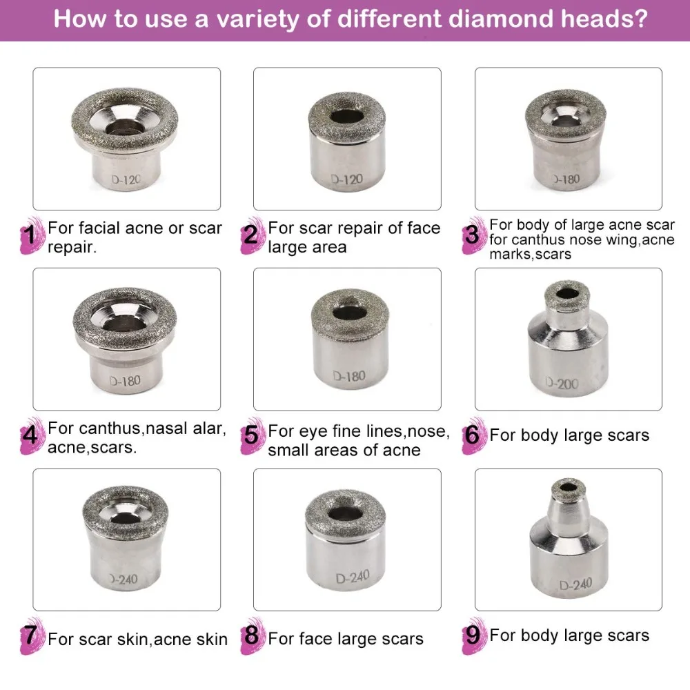 *Умеренное использование алмазной дермабразии, сопровождается продуктами кожи, которые проникают через верхний слой кожи, который достигает уровня дермы, помогает восполнять натуральные питательные вещества, восстанавливает активность клеток и способствует здоровью кожи. Все кончики сделаны деликатно и могут непосредственно близко к коже для безопасного и гигенного лечения. Нет необходимости в хрустальных картриджах или воздушном насосе для доставки кристаллов к коже, так что нет шрамов и не повредит кожу.